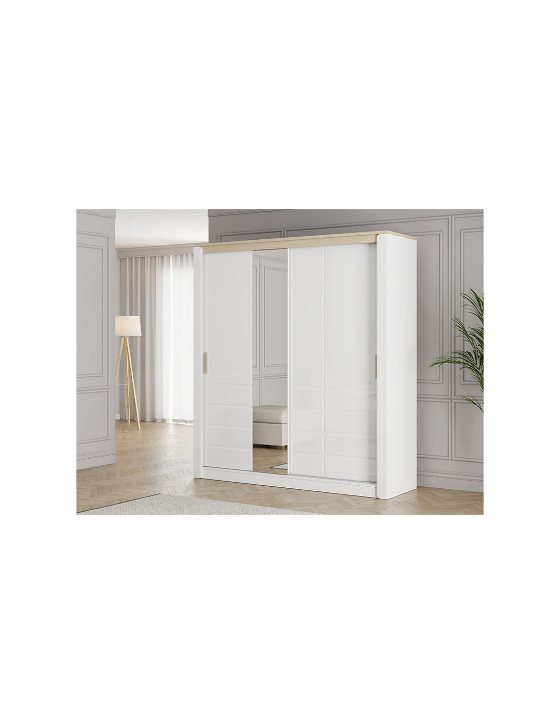 Ormar ABERDEEN 200 OG h217, izrađen u kombinaciji neprozirno bijele, svijetlog port hrasta i bijele lakirane folije, doprinosi modernom i elegantnom izgledu spavaće sobe, naglašavajući kontrast materijala i jasno definiranu geometrijsku liniju dizajna. Jedna fronta ormara opremljena je ogledalom, što dodatno poboljšava funkcionalnost i vizualno proširuje prostor.