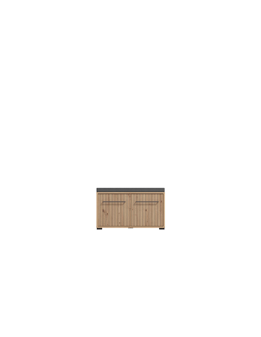 Element predsoblja LANDES KOM u kombinaciji dekora artisan hrast i hrast artisan s prugama ima praktičan dvodijelni zatvoreni dio za odlaganje obuće i jastuk za sjedeći dio u sivom uzorku.