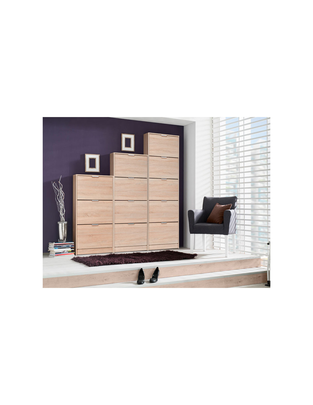 Cipelar HUGO 25, u boji sonoma hrasta, sadrži pet segmenata za odlaganje sezonske obuće, a zahvaljujući svojim dimenzijama i dvorednoj organizaciji, predstavlja vrlo efektno funkcionalno rješenje za uređenje predsoblja skromnijih dimenzija.