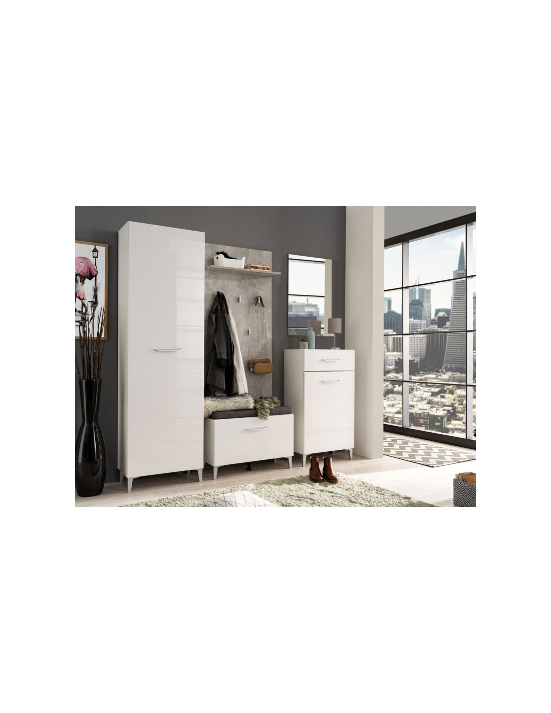 Element predsoblja Como, u bijeloj boji sa frontovima presvučenim bijeloj 3D MDF lak folijom. Dio je istoimene kolekcije koju odlikuje moderan dizaj i funkcionalno organiziraj prostor. Posjeduje praktičan zatvoreni segment za odlaganje obuće. Kao i tapaciranu površinu da se može sjesti.