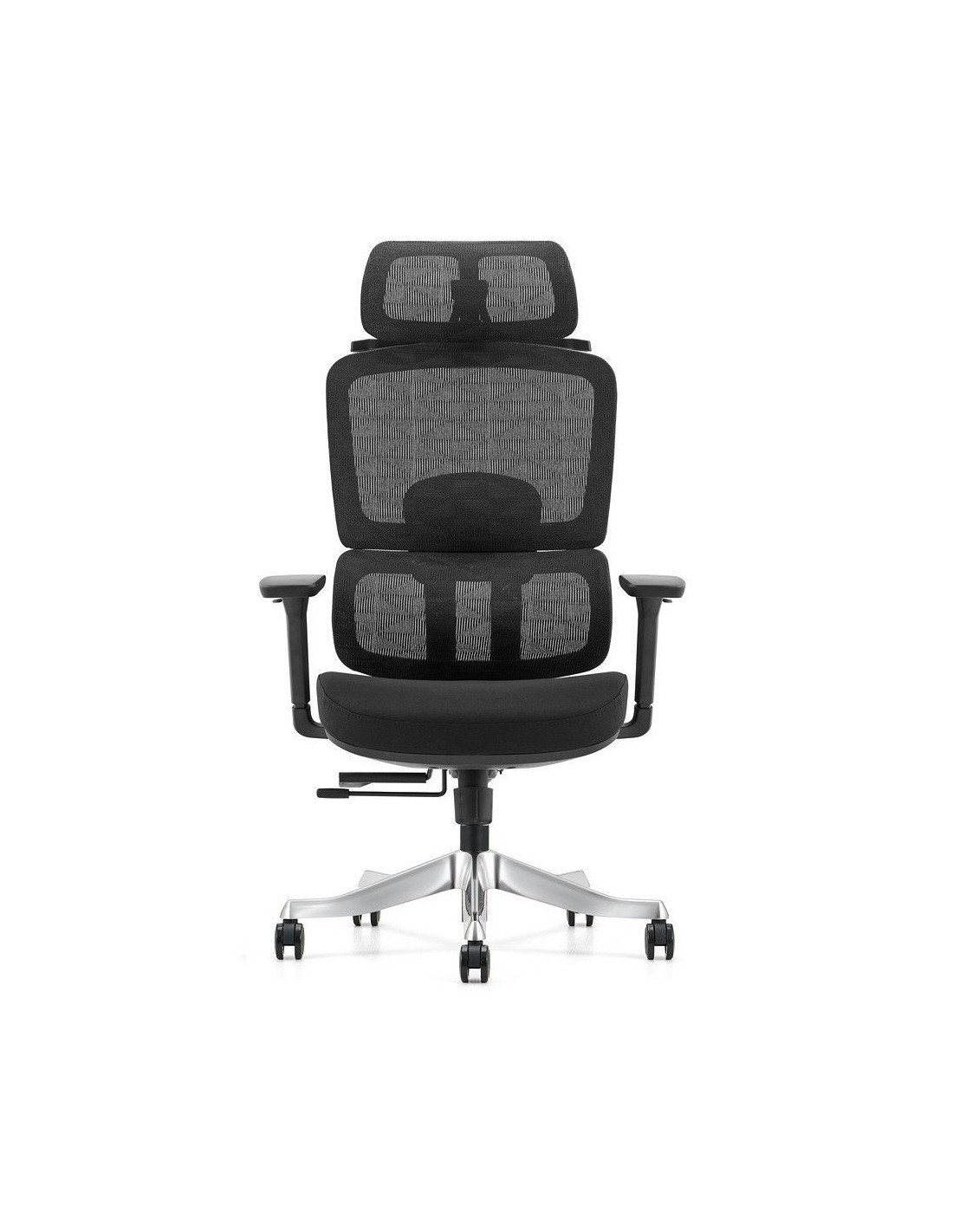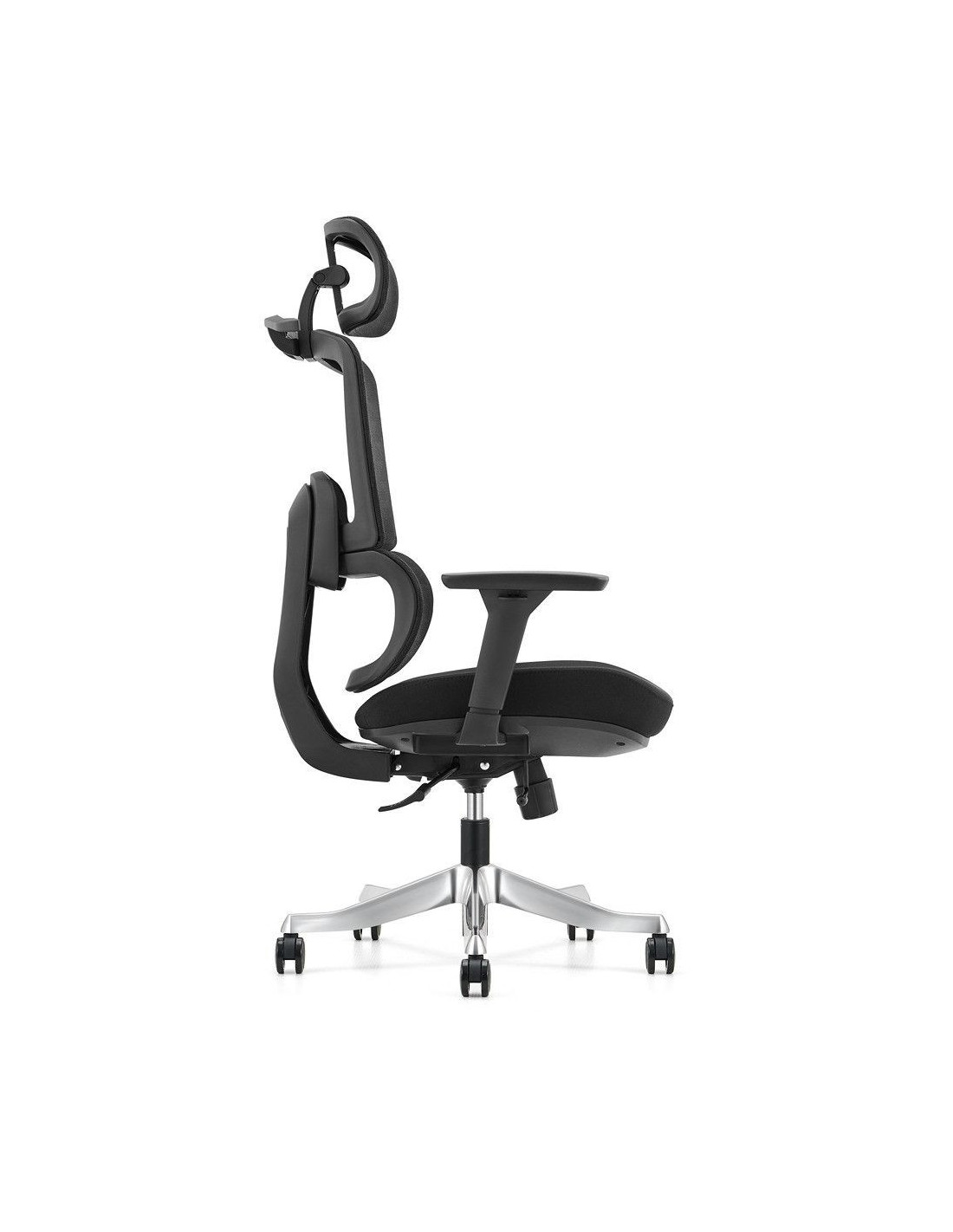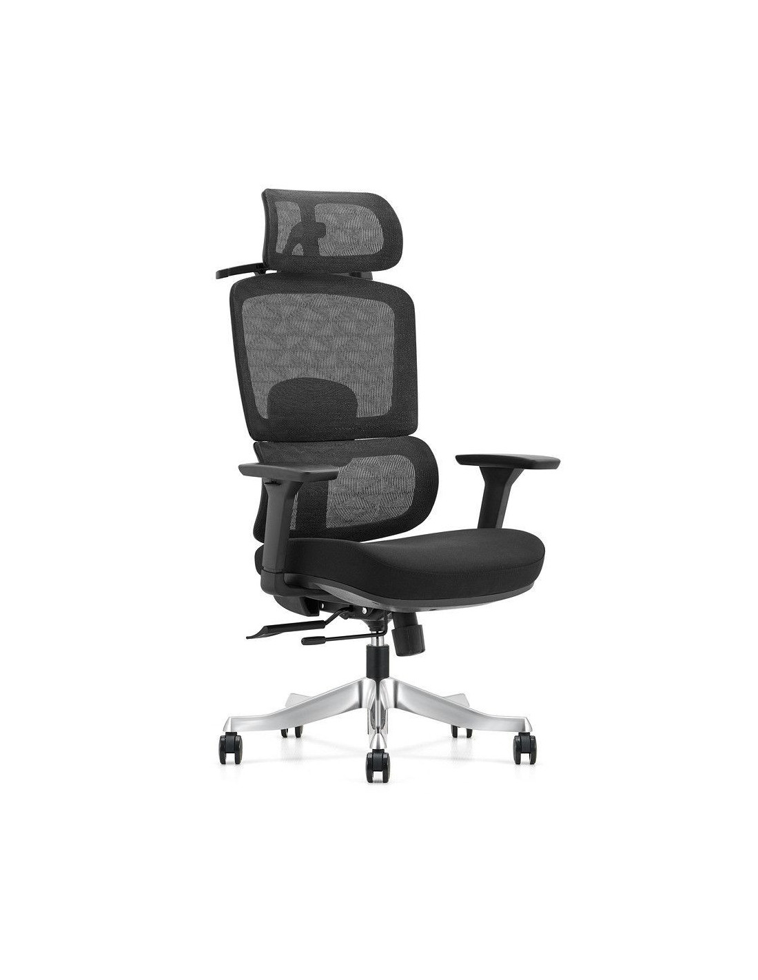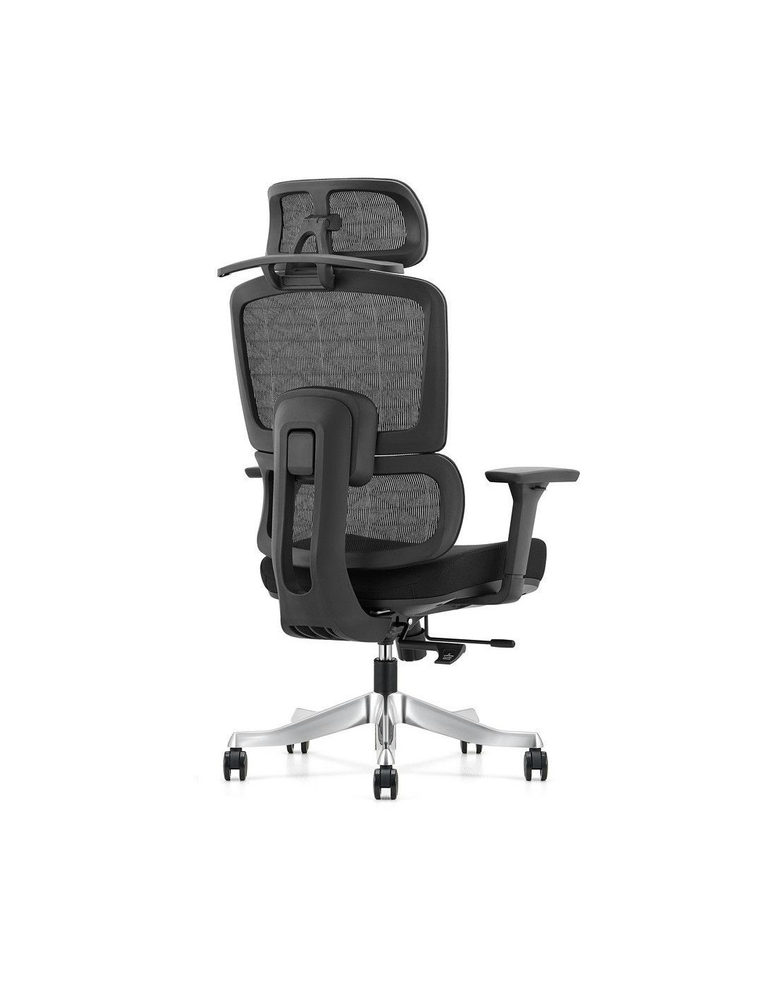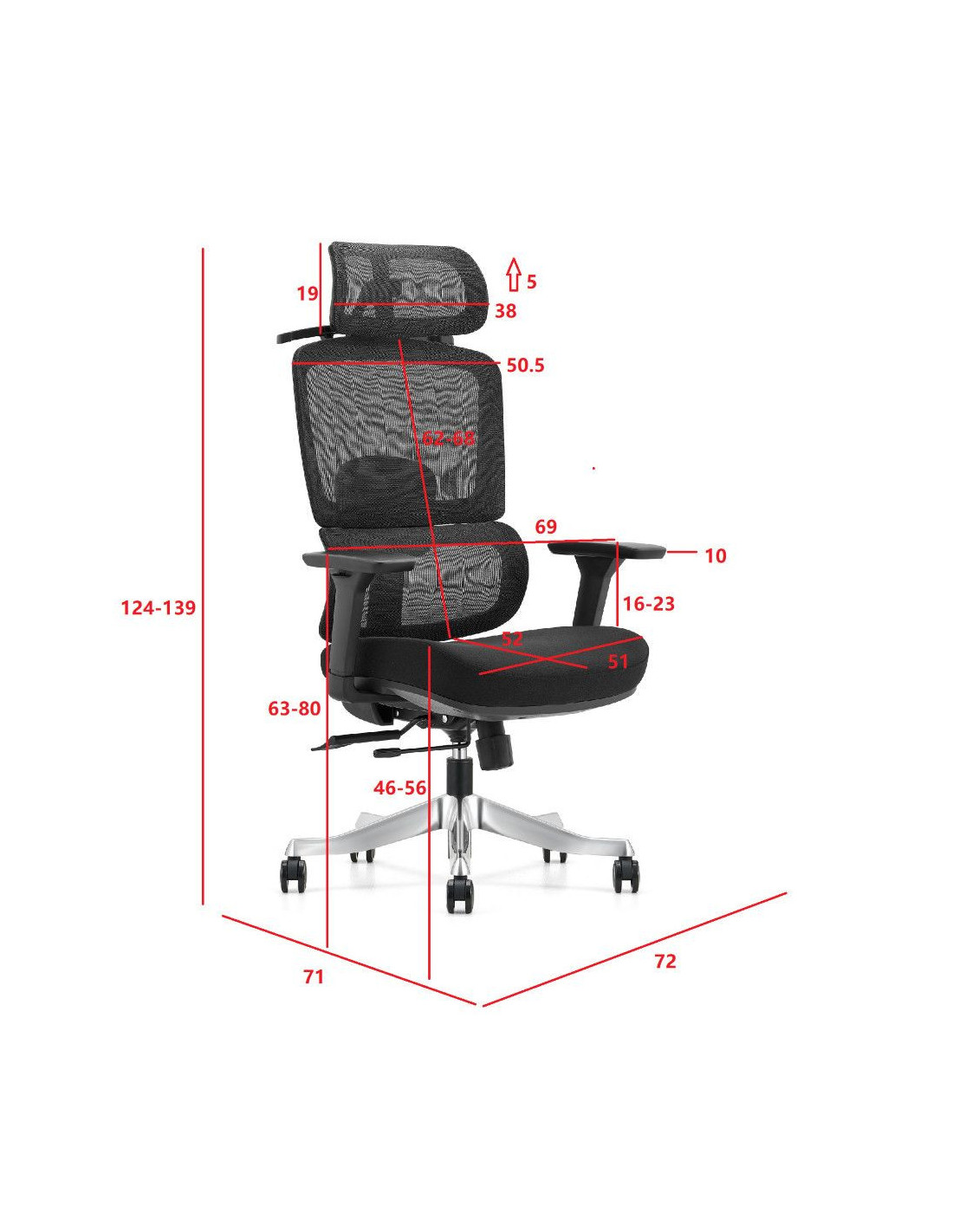 Ergonomska uredska stolica u crnoj boji, prikladna za ured budućnosti! Stolica je okretna i podesiva po visini, s mehanizmom za plinsko podizanje u glavnom stupu, a nudi i nekoliko drugih mogućnosti podešavanja. Naslon stolice izrađen je od najlona i presvučen prozračnom mrežastom tkaninom. Opremljena je mehanizmom koji omogućuje podešavanje visine naslona neovisno o glavnom mehanizmu za plinsko podizanje. Naslon također ima podesivu lumbalnu potporu, 2D podesivi naslon za glavu i ugrađenu vješalicu na koju možete objesiti jaknu ili drugu odjeću. Crni nasloni za ruke izrađeni su od poliuretana i podesivi su u tri dimenzije. Mehanizam s više položaja s klizačem omogućuje podešavanje odgovarajuće dubine stolice po želji. Sjedalo je ispunjeno injekcijskom pjenom za veću udobnost. Baza stolice izrađena je od aluminija i ima PU kotače od 60 mm s tihim kretanjem. Maksimalna nosivost je 120 kg.