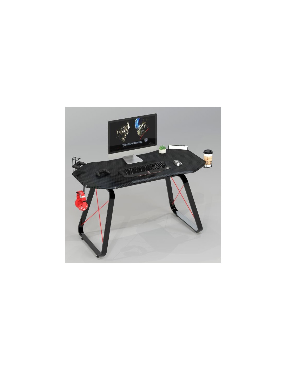Radni stol koji će vas impresionirati svojim modernim izgledom. Ploča stola i polica izrađene su od MDF-a, presvučene PVC-om u crnom laminatu od karbonskih vlakana. Površina je crna s 3D teksturom. Metalne noge su u obliku slova i premazane crnom bojom u prahu. Stol nije samo moderan, već je i izuzetno praktičan. O tome se brinu dodaci poput držača za slušalice i držača za vaše omiljeno piće.