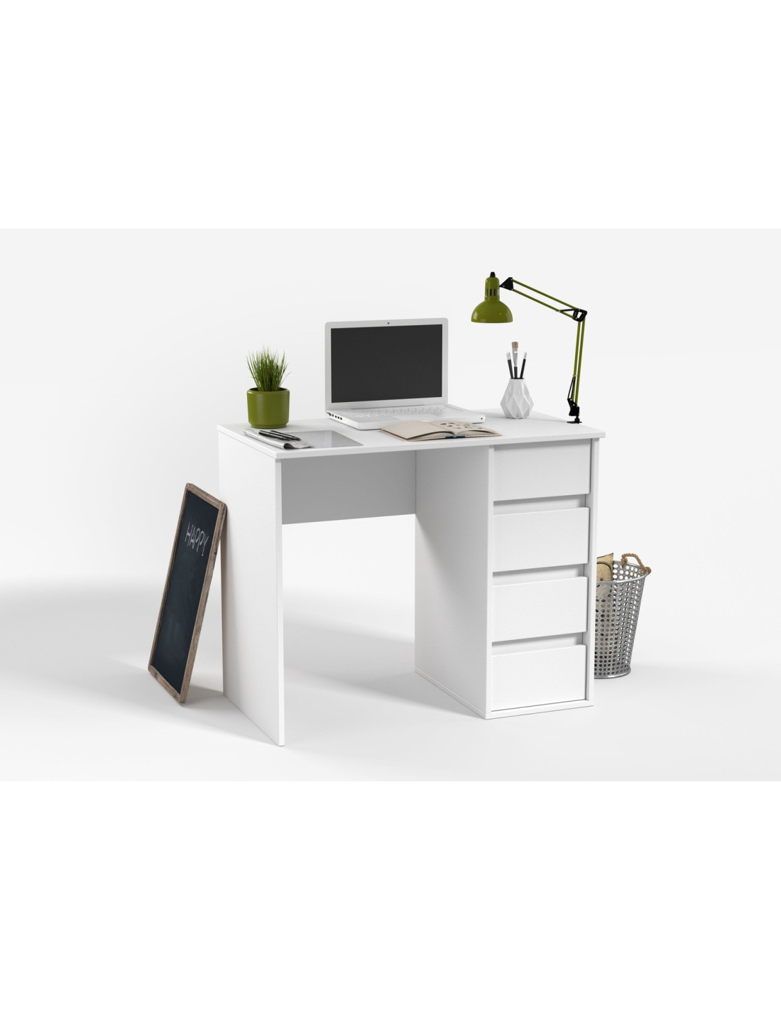 Moderan pisaći stol izrađen od drvenog materijala, u bijeloj boji. Opremljen je s 4 ladice. Na ovom prostranom stolu, dimenzija 90 x 75 x 50 cm, ima dovoljno prostora za Vaše računalo, dokumentaciju ili uredski pribor. Kombinirajte ga s drugim artiklima iz naše ponude i opremite svoj ured ili radnu sobu vrhunskim namještajem.