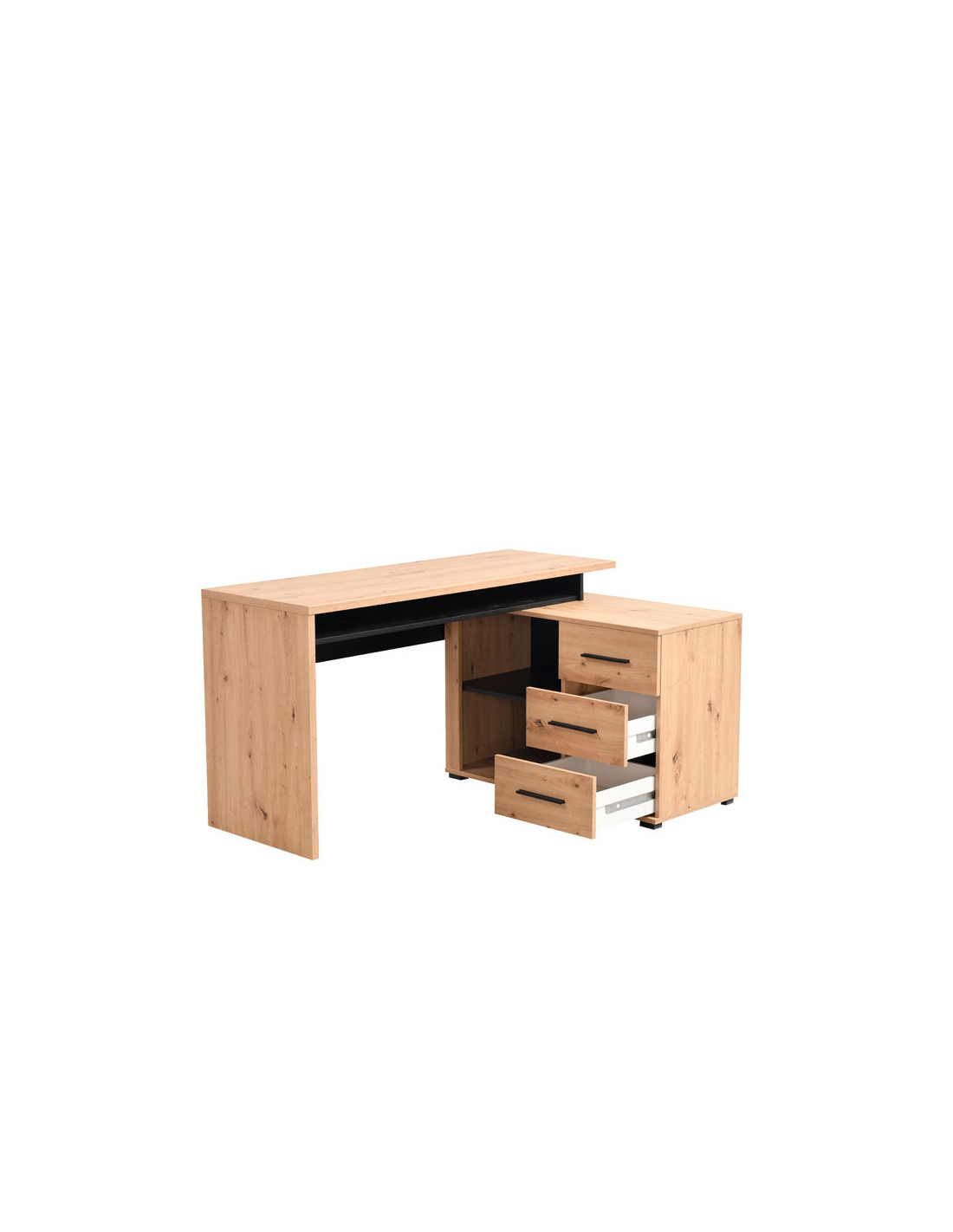 ARHIMED računalni stol, u kombinaciji dekora hrasta i crnog drva, sastoji se od površine stola i podesivog elementa koji se može montirati pod kutom od 90 i 180 stupnjeva te će biti idealan za sortiranje dokumenata i važnih stvari jer ima 3 praktične ladice i otvoreni dio s policom.
