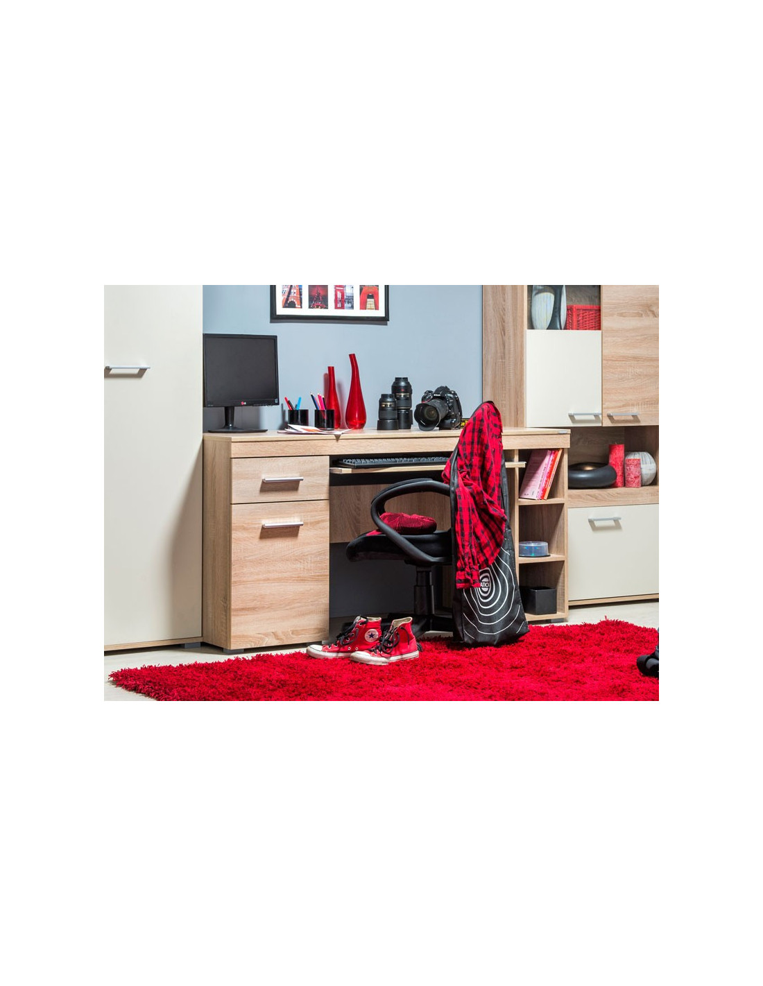 Ozbiljan stol za ozbiljne projekte - sa policom za tipkovnicu koja se izvlači i ladicom i zatvorenom policom za maksimalnu iskorištenost prostora za odlaganje. Sa druge strane se nalaze otvorene police za odlaganje i kućišta računala.