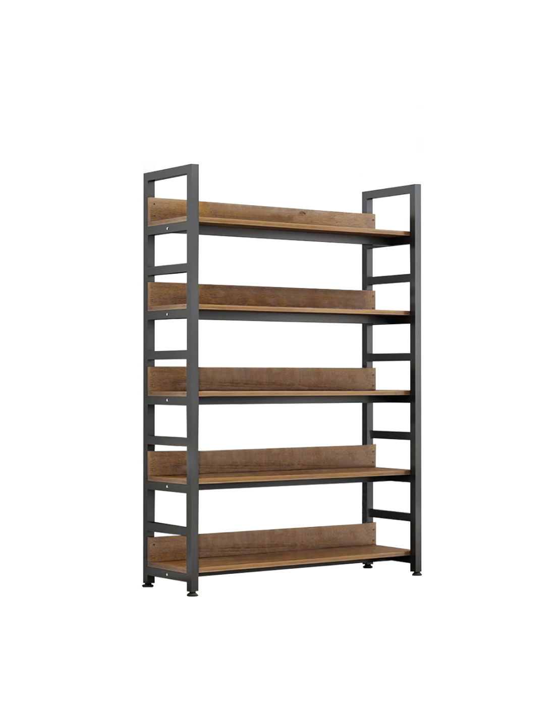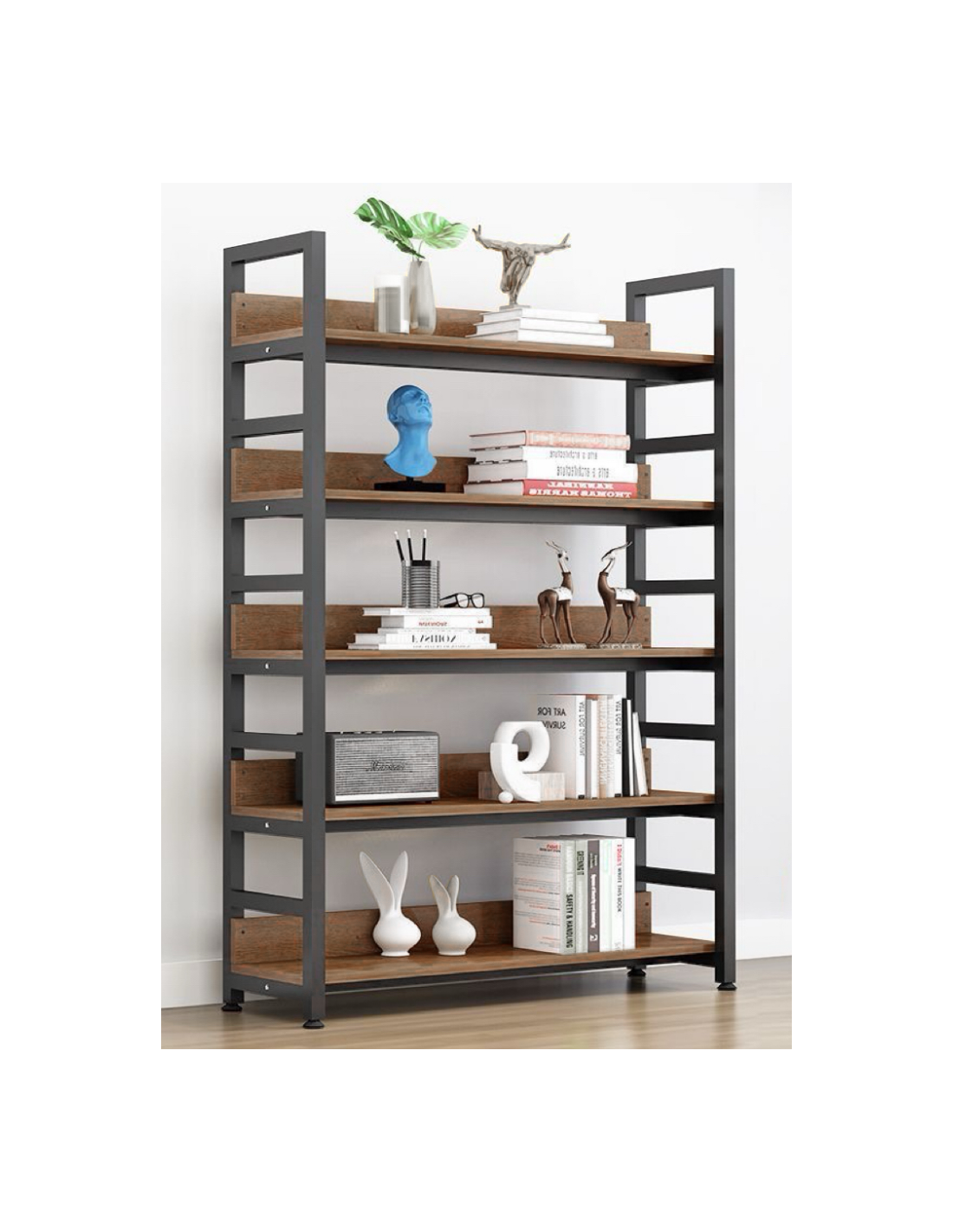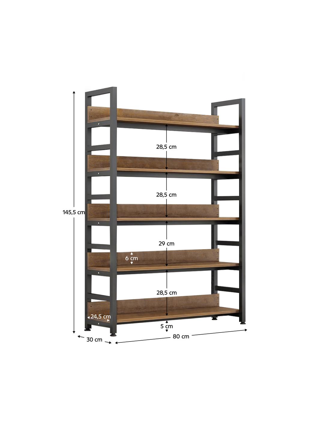 Praktična polica JANEL TYPE 1 bit će idealno rješenje ako tražite moderan i praktičan prostor za pohranu za dnevni boravak, dječju ili studentsku sobu ili ured. Stabilnost je osigurana zahvaljujući metalnoj konstrukciji u klasičnoj crnoj boji. Police su izrađene od laminiranog MDF-a u ugodnoj tamnoj nijansi hrasta. Pet prostranih polica nudi dovoljno otvorenog prostora za pohranu knjiga, ukrasa ili drugih predmeta koje trebate imati pri ruci.