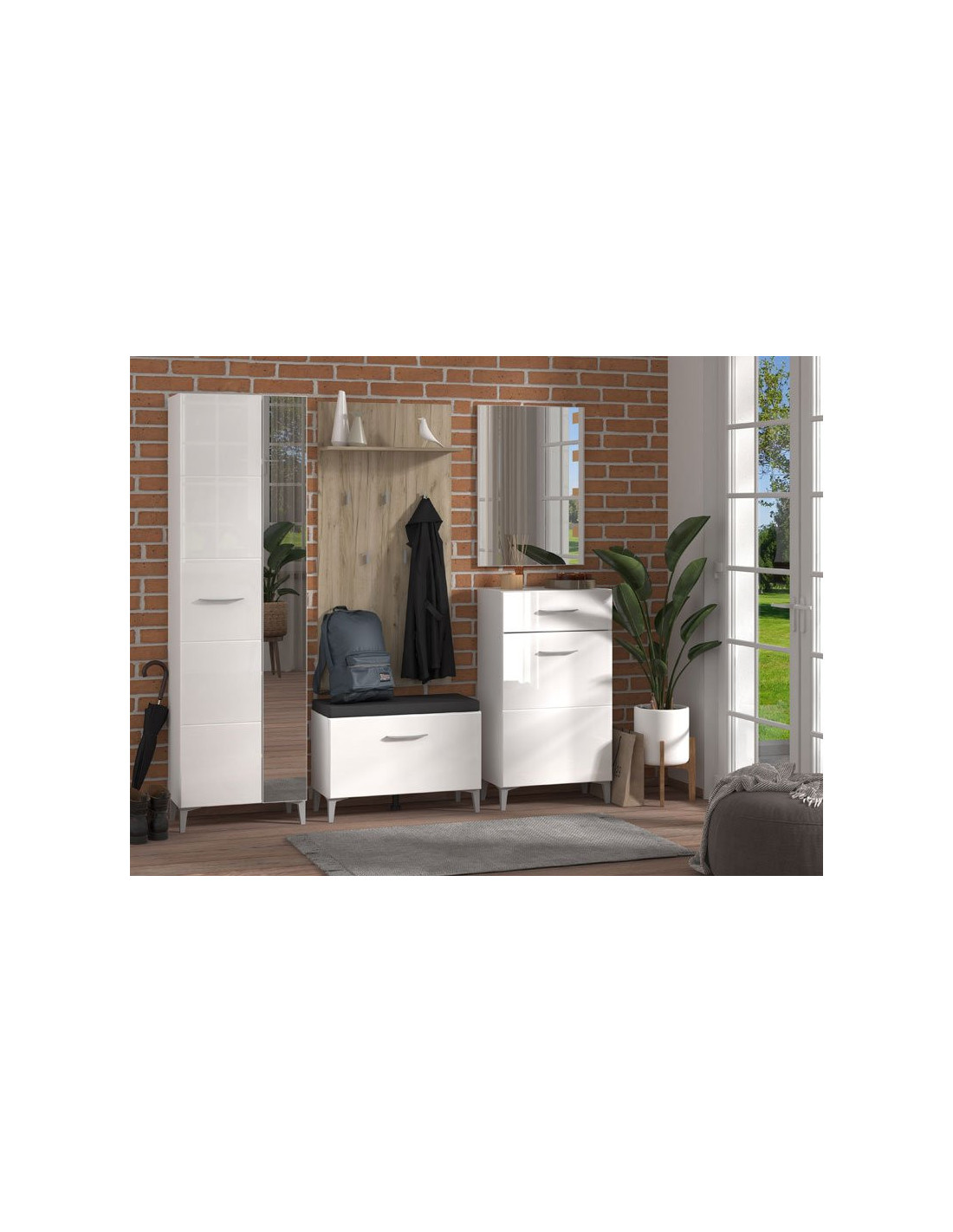 Element za predsoblje COMO P2 OG, odvažnog bijelog uzorka s frontama obloženim bijelom 3D MDF lak folijom s aplikacijom, dio je istoimene kolekcije koju odlikuje moderan dizajn i funkcionalno organiziran uporabni prostor. U ovom predsobnom elementu od dvije ploče s ogledalom prostor za odlaganje je praktično organiziran i sadrži šipku za odjeću i tri funkcionalne police. Može se kombinirati s istoimenim elementima koji zaokružuju interijernu priču ulaza u Vaš dom.