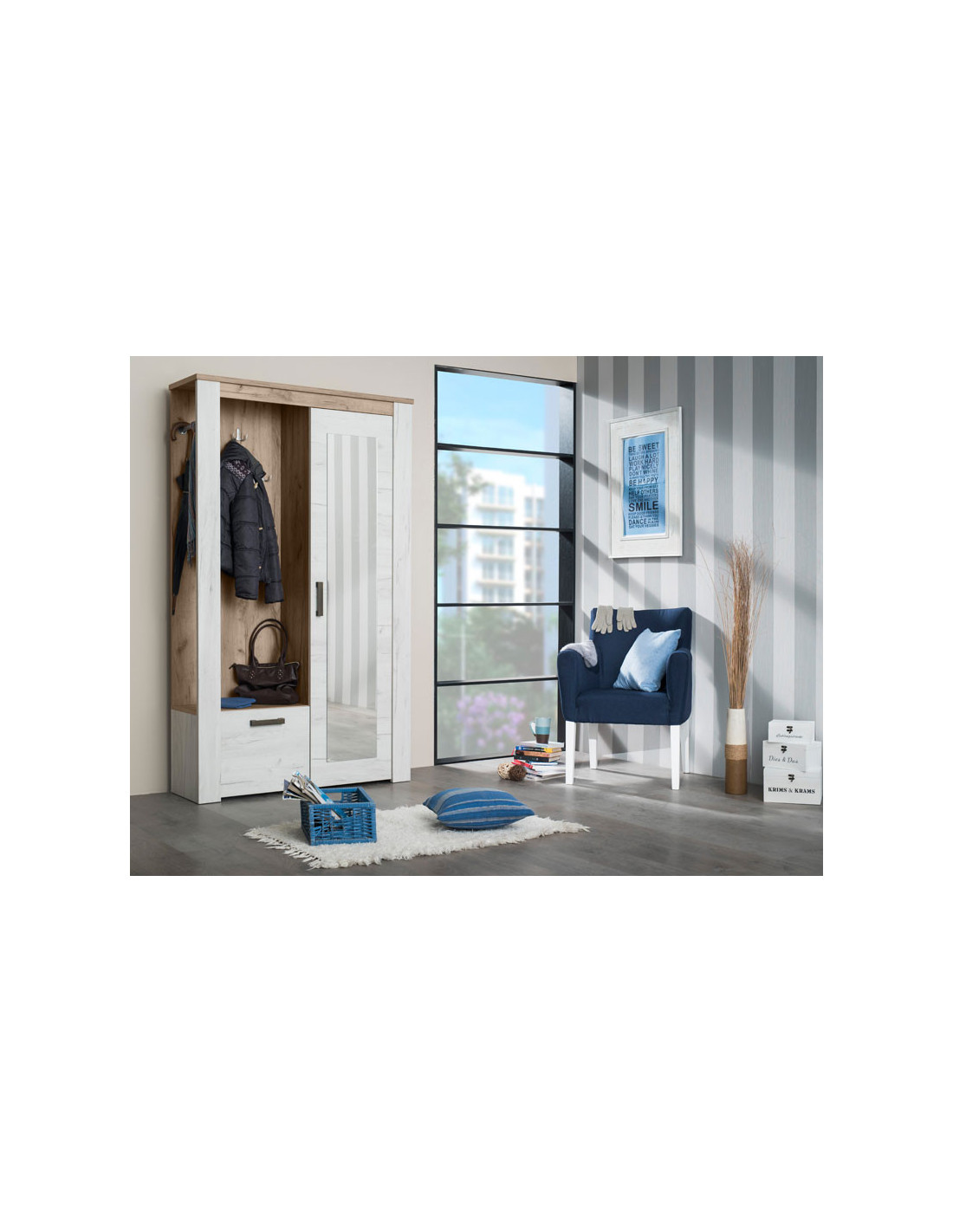Predsoblje KENT, u bijelom i sivom hrastovom dezenu, dio je istoimene kolekcije koja u vašem domu unosi dodir otmjene klasike i rafiniranog ukusa. Ovaj model posjeduje segment sa policama, manji dio pogodan za sezonsku obuću, vješalicu i ogledalo koje svakom predsoblju daje notu prostranosti i vedrine.