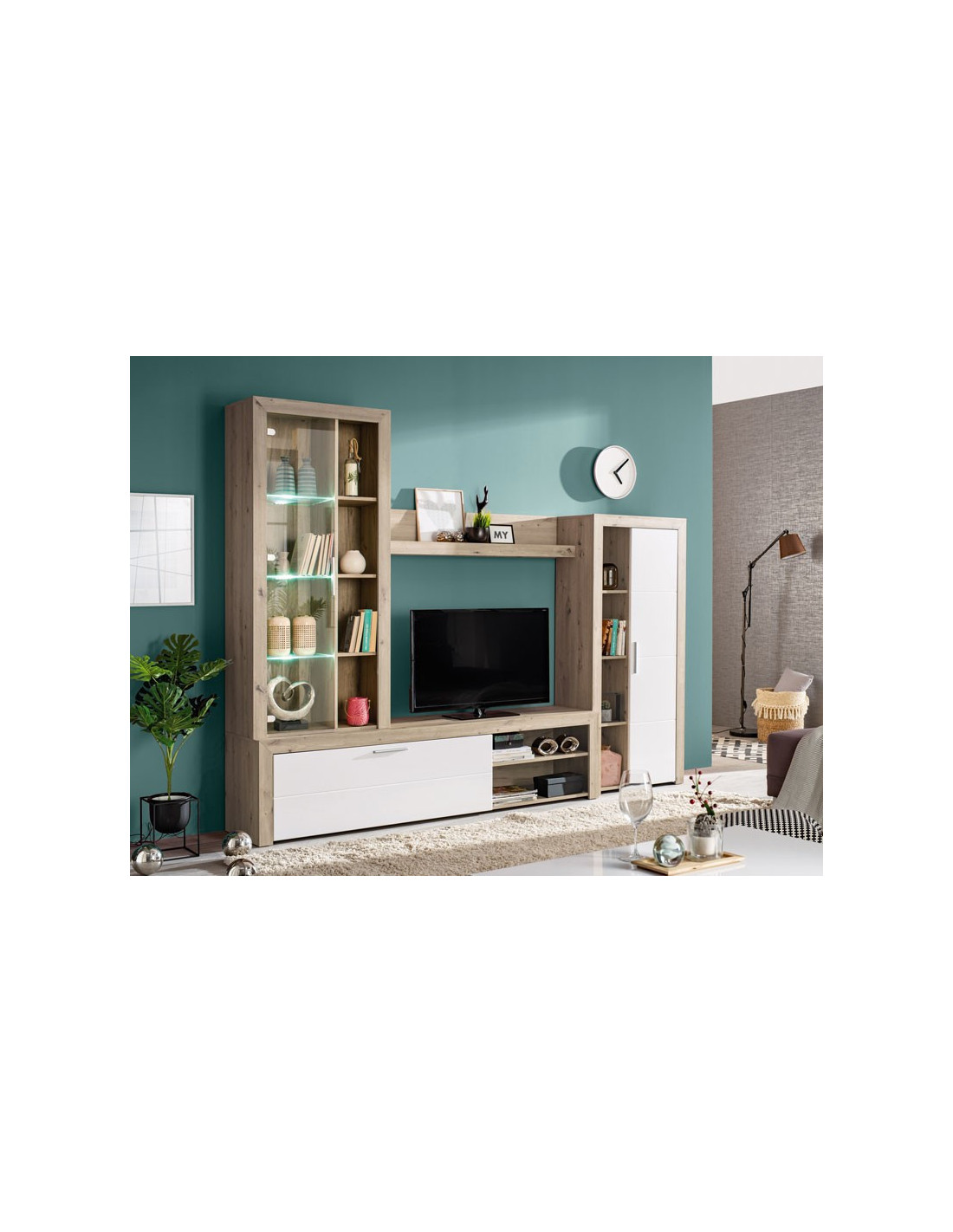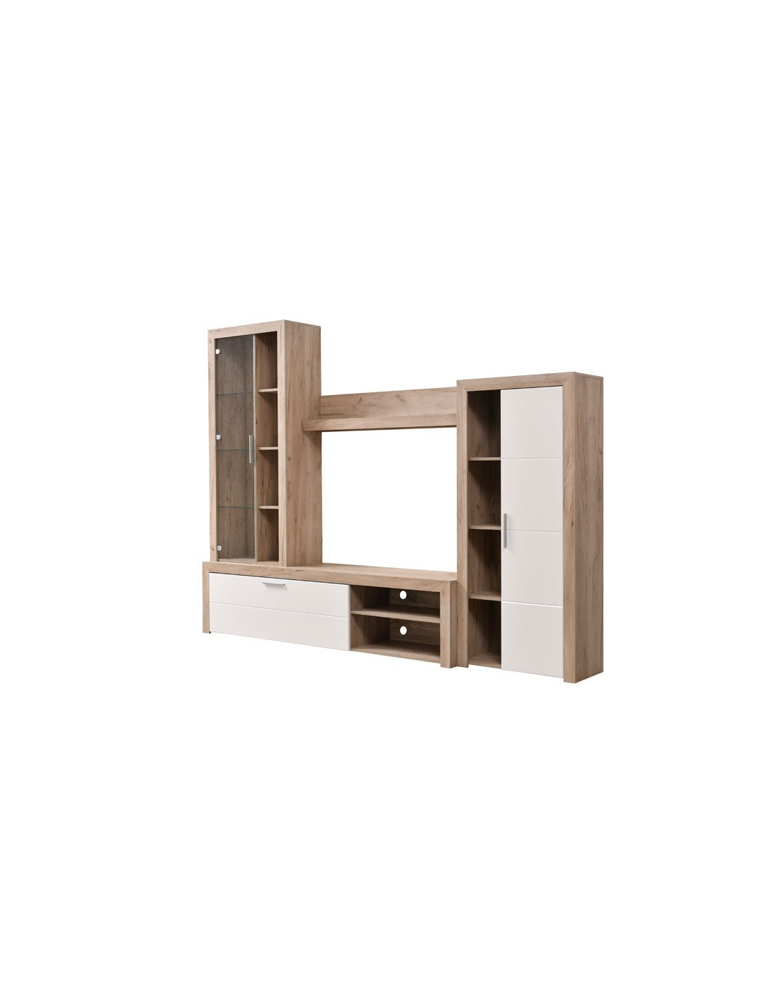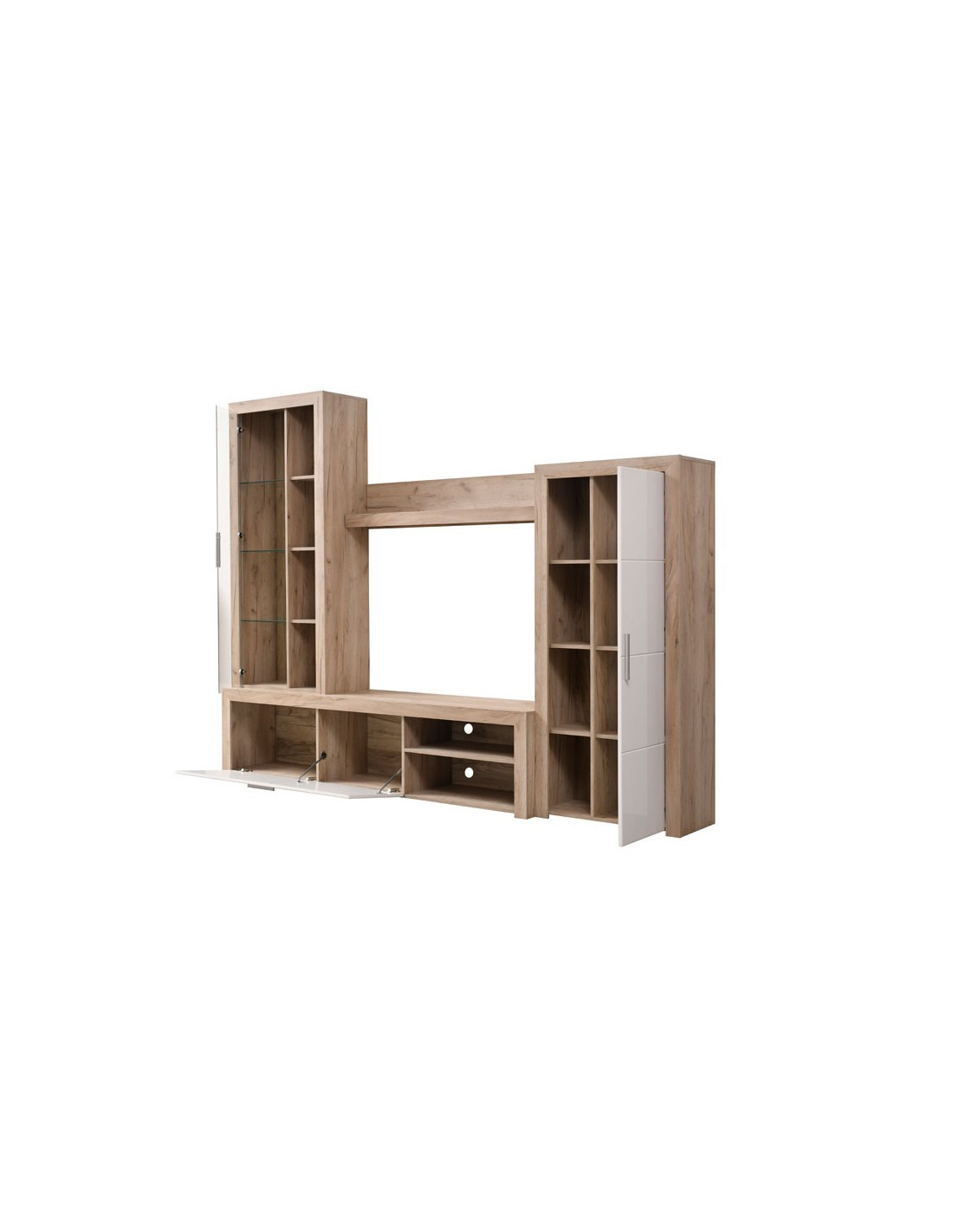 Regal MERIDA, ukrašen sivom hrastovom i bijelom lakiranom folijom, kompaktni je model regala za funkcionalni i estetski dizajn dnevnog boravka. Sastoji se od otvorenih, zatvorenih polica, staklenog dijela s tri staklene police i ormarića s jednom rešetkom s policama, što posebno ističe njegovu korisnu vrijednost.