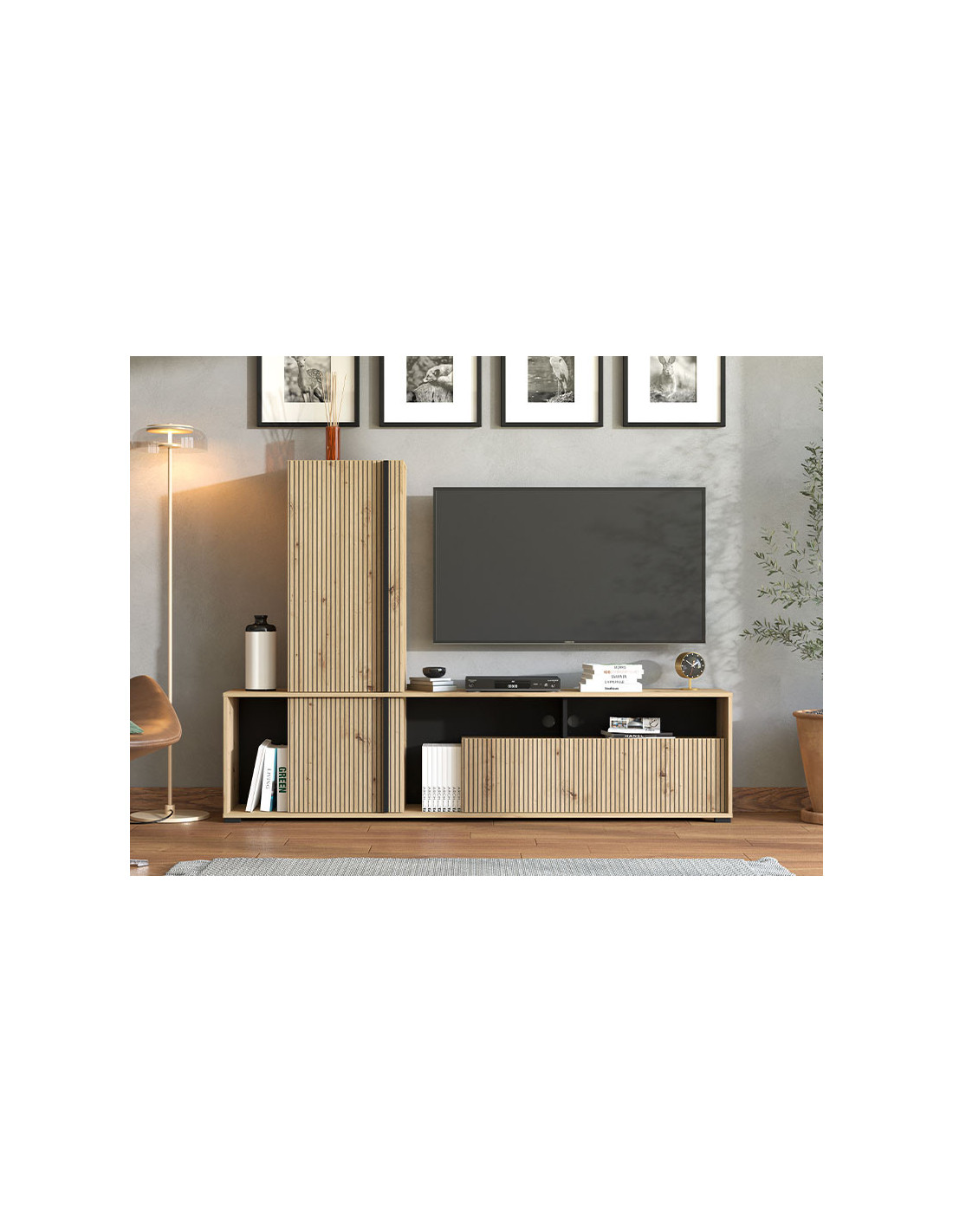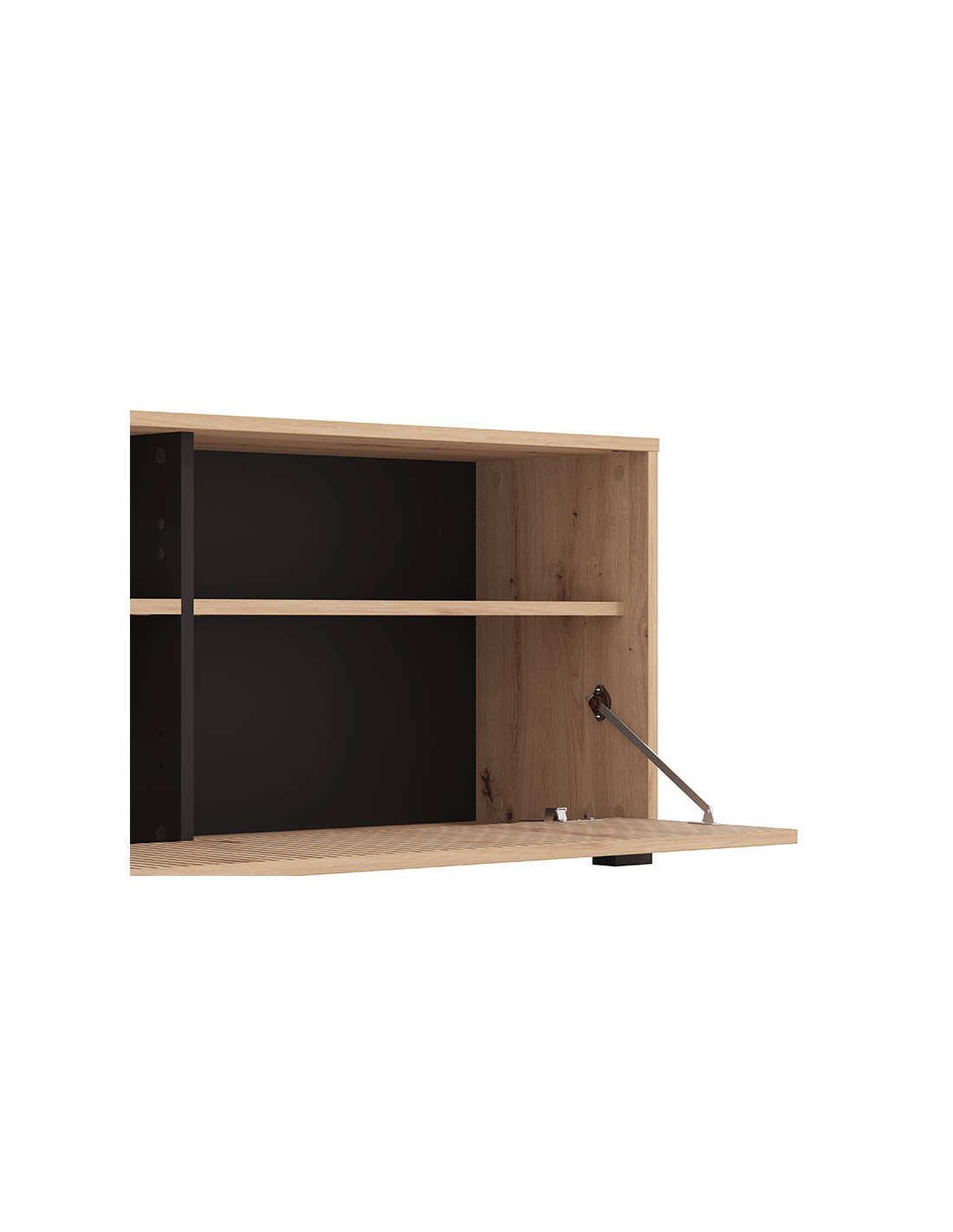 Regal CHANIA, u kombinaciji dekora artisan hrasta, artisan hrasta sa prugama, crne mat folije i crnog dekora dizajniran je da zadovolji funkcionalne i estetske zahtjeve u uređenju ambijenta dnevnog boravka. Regal CHANIA omogućuje praktično opremanje dnevnog boravka, zahvaljujući upotrebnom prostoru koji čine kako otvorene , tako i zatvorene police za odlaganje, kao i prostor predviđen za TV uređaj i ostalu audio-vizualnu opremu.