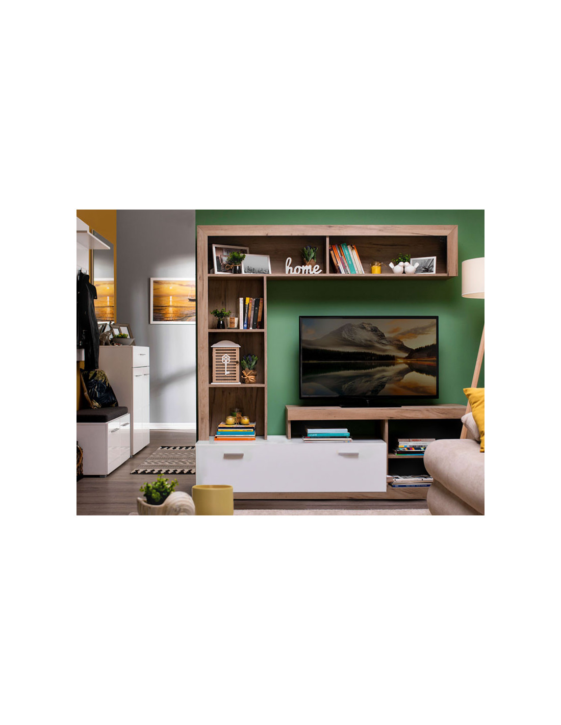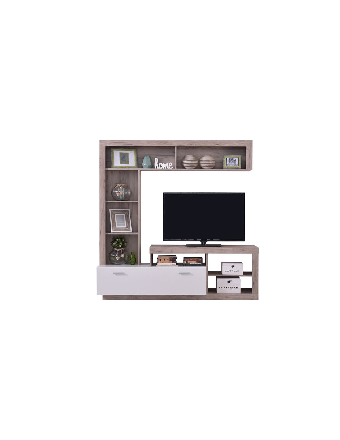 Regal GLEN prati sklad forme i funkcije, kao i upečatljiv dizajn namijenjen modernom osvježenju dnevnog boravka. Zatvoreni dio, centralno postavljena TV polica i otvoreni segmenti tvore kompaktnu cjelinu za pohranu svih vaših dragocjenih sitnica i audio-vizualnih uređaja.