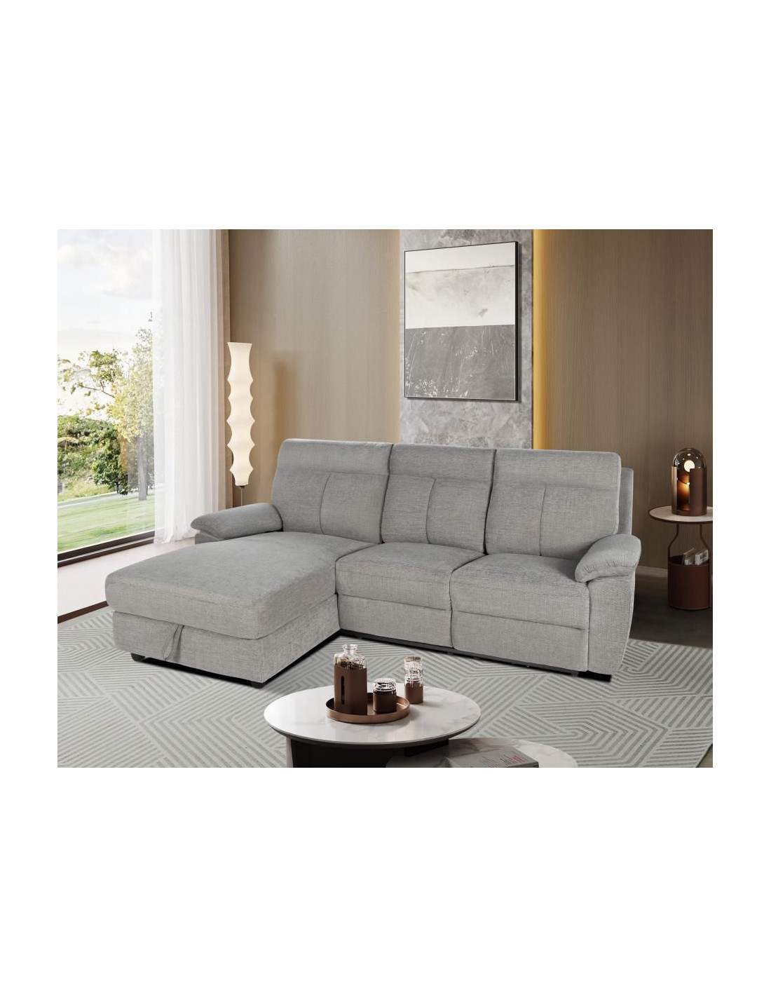 Udobna garnitura s naslonjačem i kutijom za pohranu. Presvučena je mekom i izdržljivom tkaninom u svijetlo sivoj boji koja se dobro uklapa u širok raspon stilova interijera. Debelo podstavljeni naslon i nasloni za ruke pružaju iznimnu udobnost i opuštanje čak i u svakodnevnoj upotrebi.