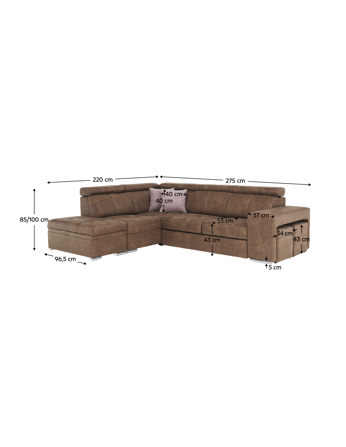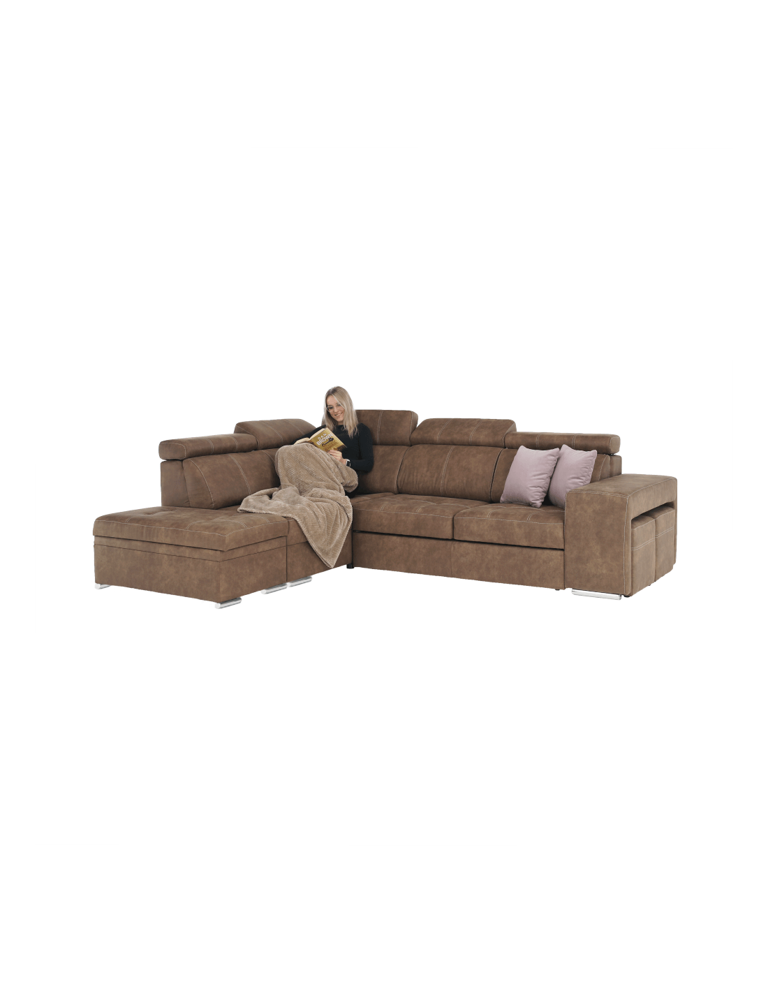 Tražite li novu garnituru za sjedenje, ali se ne možete odlučiti? Danas na tržištu postoji veliki broj garnitura za sjedenje, ali imate dilemu, koja je prava za vas? Imamo originalan savjet za vas u obliku potpuno tapecirane kutne garniture LANZA. Osim što je moderna i idealno se uklapa u vaš interijer, nudi i nenametljiv dizajn s mnogim funkcijama. Prostor za pohranu pronaći ćete u bočnom otomanu. Lanza je opremljena pozicionirajućim uzglavljem, koje osigurava udoban oslonac za leđa i glavu. U slučaju neočekivanog posjeta, kauč možete rasklopiti u povremeni ležaj i tako dobiti prostor za spavanje dimenzija 120x190 cm. Kauč također ima dva taburea, koji se nalaze u naslonu za ruke. Izrađen od visokokvalitetne tkanine s efektom brušene kože Preston u smeđoj boji. Tkanina Jasmine u svijetlo ljubičastoj boji prekrasno se ističe na dva ukrasna jastuka koja dolaze uz kauč. Jezgra sjedala je falista opruga i HR pjena. Počastite se praktičnošću i modernim dizajnom ove originalne garniture za sjedenje.