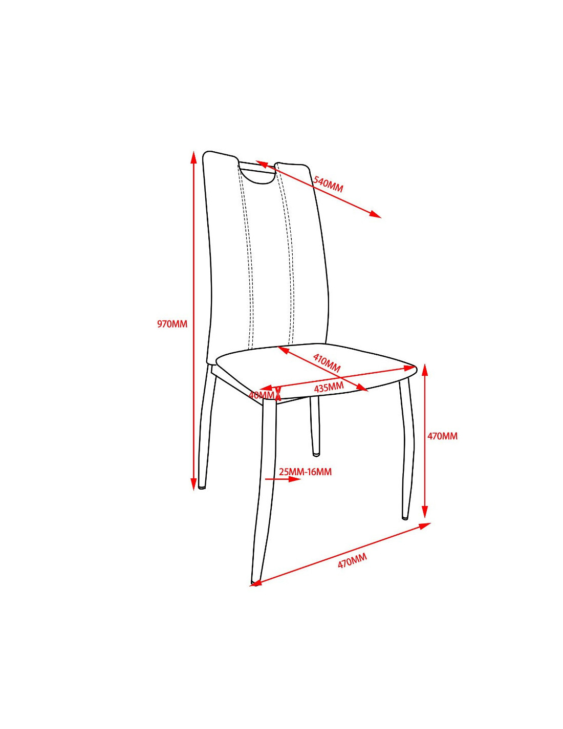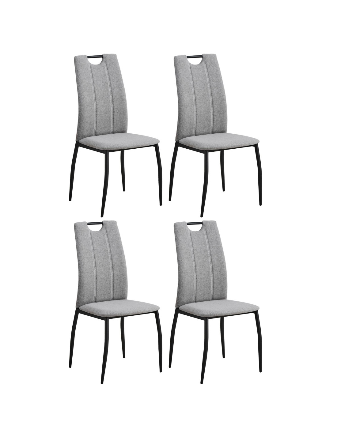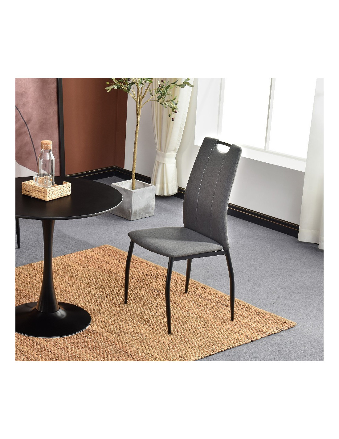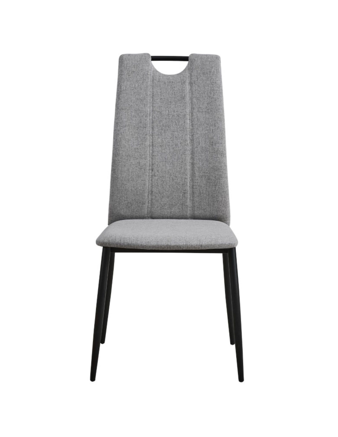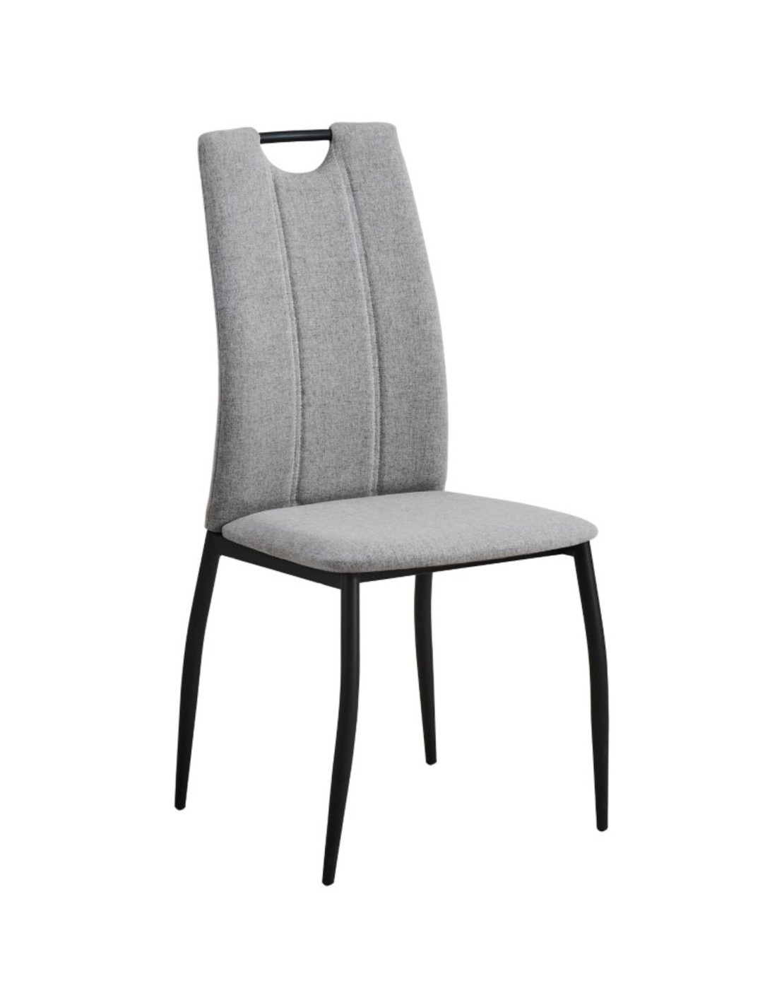 Jednostavna blagovaonska stolica s ergonomskim naslonom. U potpunosti je presvučena kvalitetnom tkaninom u sivoj boji. Sjedalo debljine 4 cm omogućuje udobno sjedenje, a naslon je opremljen i ručkom za jednostavno pomicanje stolice. Maksimalna nosivost stolice je 120 kg.