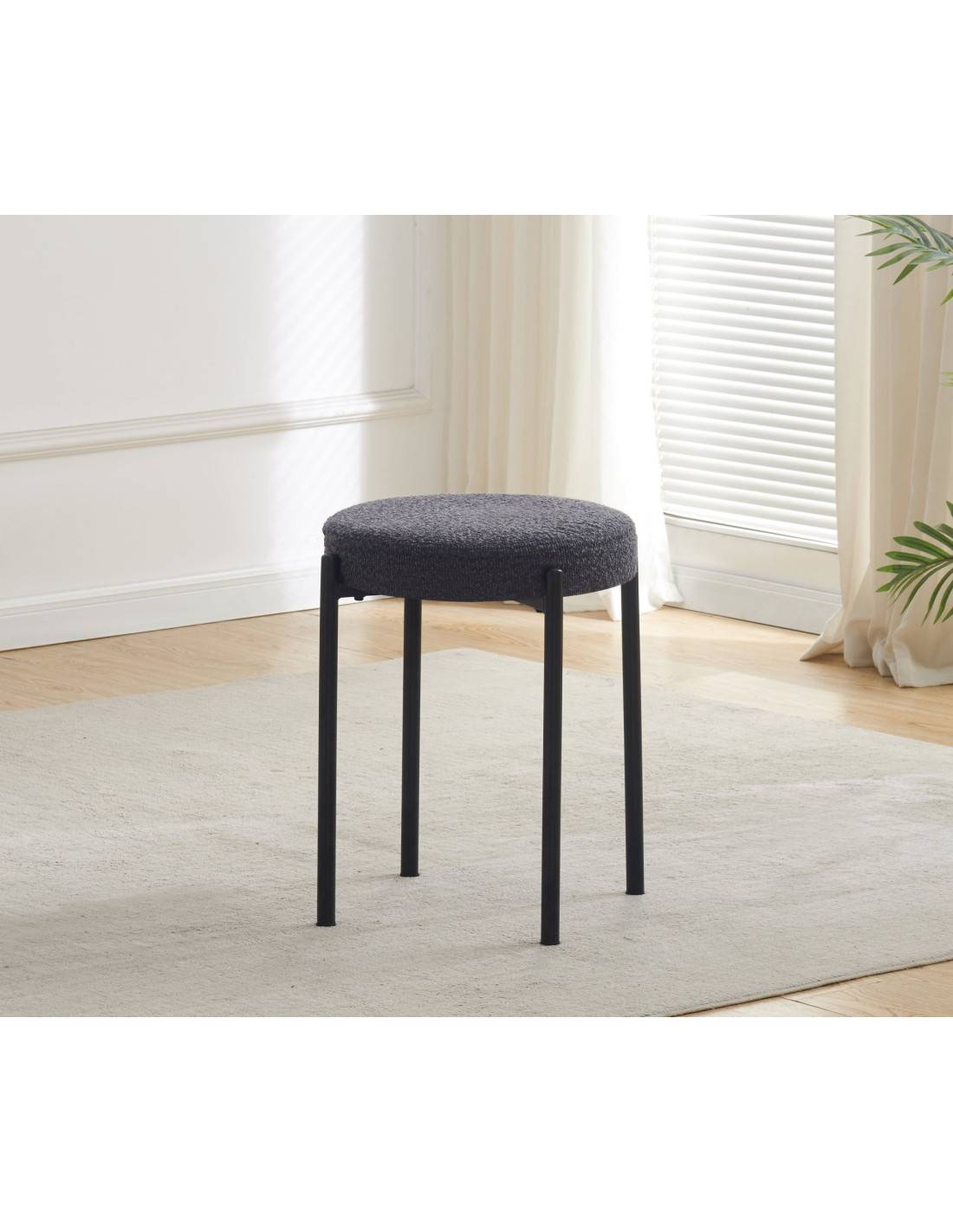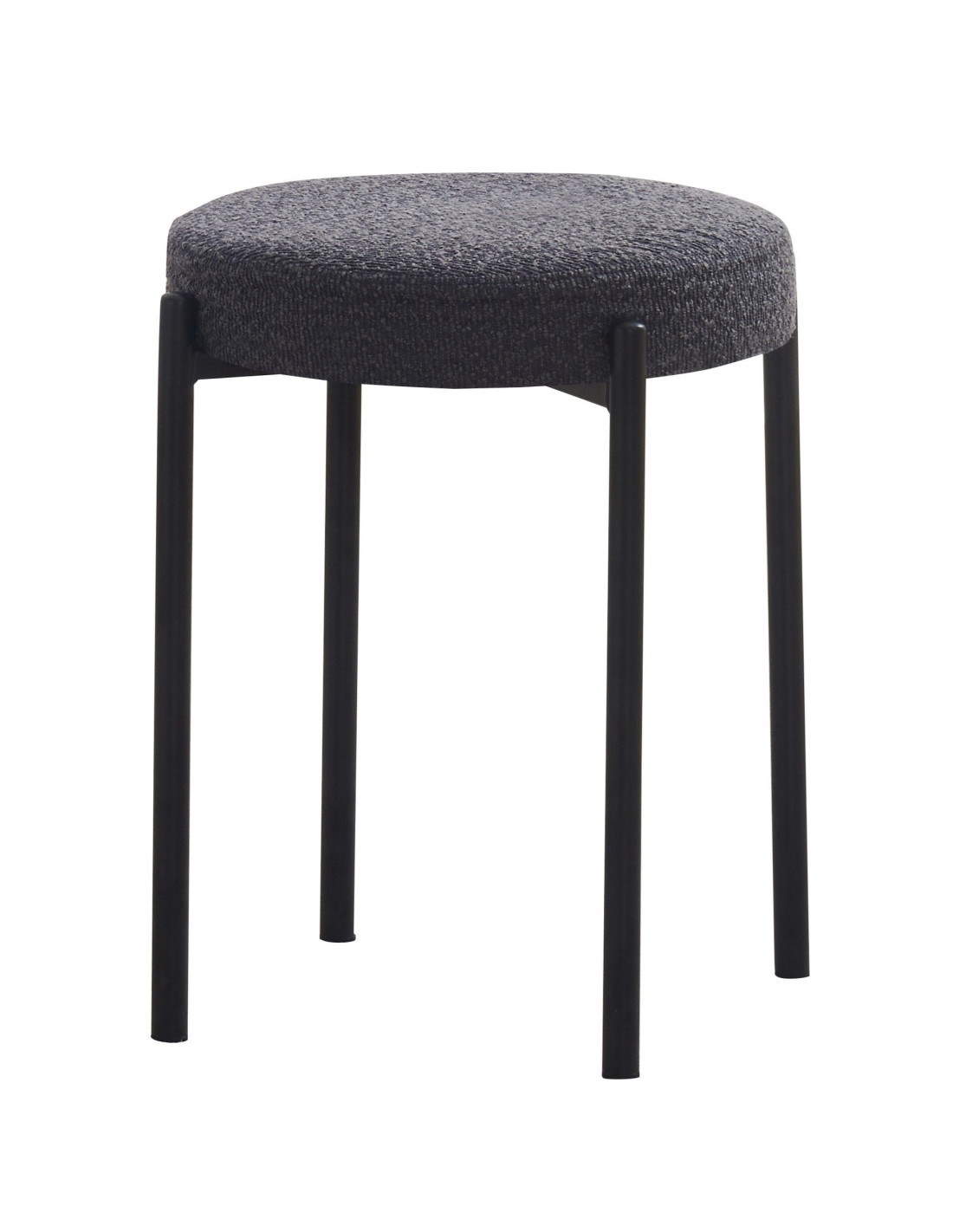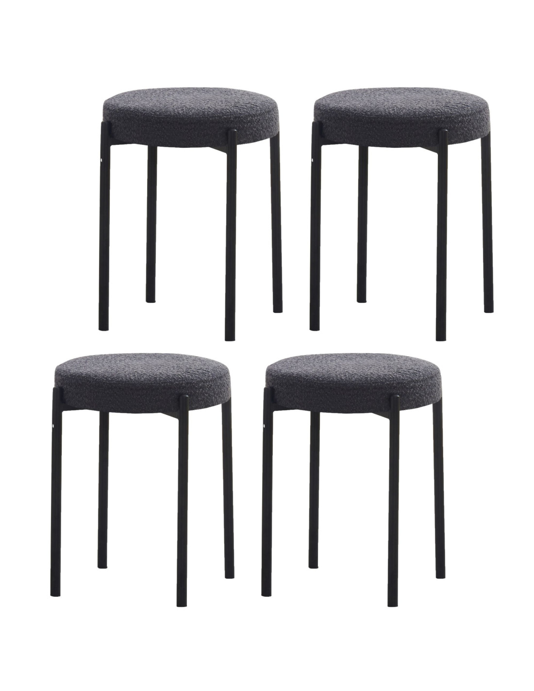 Tapecirana stolica za slaganje dizajnirana za fleksibilnu upotrebu u kuhinjama, blagovaonicama, kafićima ili drugim višenamjenskim prostorima. Kada se ne koristi, više stolica može se složiti zajedno kako bi zauzele manje prostora. Sjedalo je tapecirano tkaninom, dostupnom u nekoliko boja - svijetlo sivoj, sivoj te zelenoj, što olakšava usklađivanje s različitim stilovima interijera. Tapeciranje pruža meku površinu koja povećava udobnost sjedenja u usporedbi s tvrđim sjedalima, a istovremeno stolici daje sofisticiraniji izgled unatoč minimalističkom dizajnu s izloženom metalnom bazom. Sjedalo ima promjer 37,5 cm i visinu 49 cm. Stolica se isporučuje potpuno sastavljena, što omogućuje trenutnu upotrebu bez dodatnog alata ili opreme. Ispod sjedala nalazi se metalni okvir s crnim praškastim premazom za izdržljivu, blago teksturiranu površinu koja poboljšava izdržljivost i otpornost na ogrebotine, a istovremeno smanjuje vidljivost otisaka prstiju i malih mrlja. Okvir se sastoji od tankih, ravnih nogu postavljenih blizu oboda sjedala, što stolici daje dobru stabilnost.