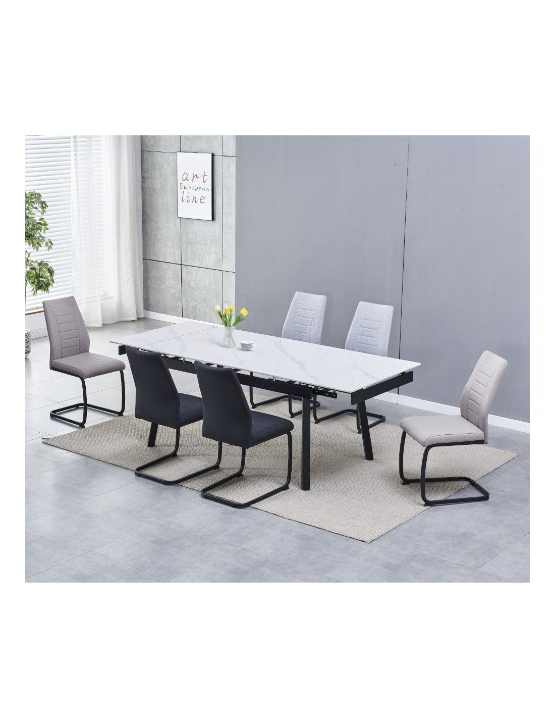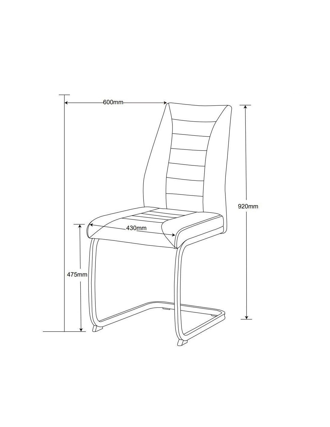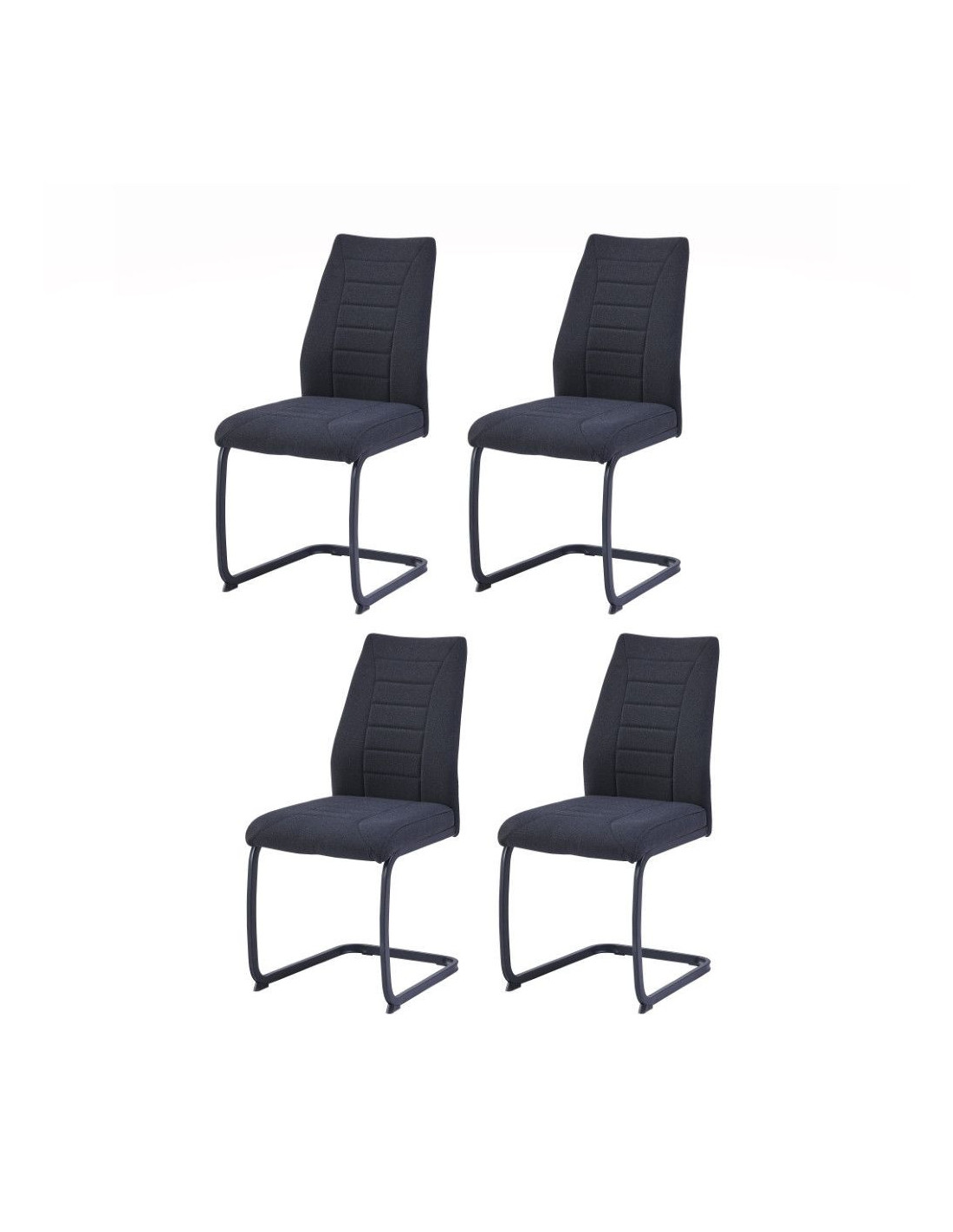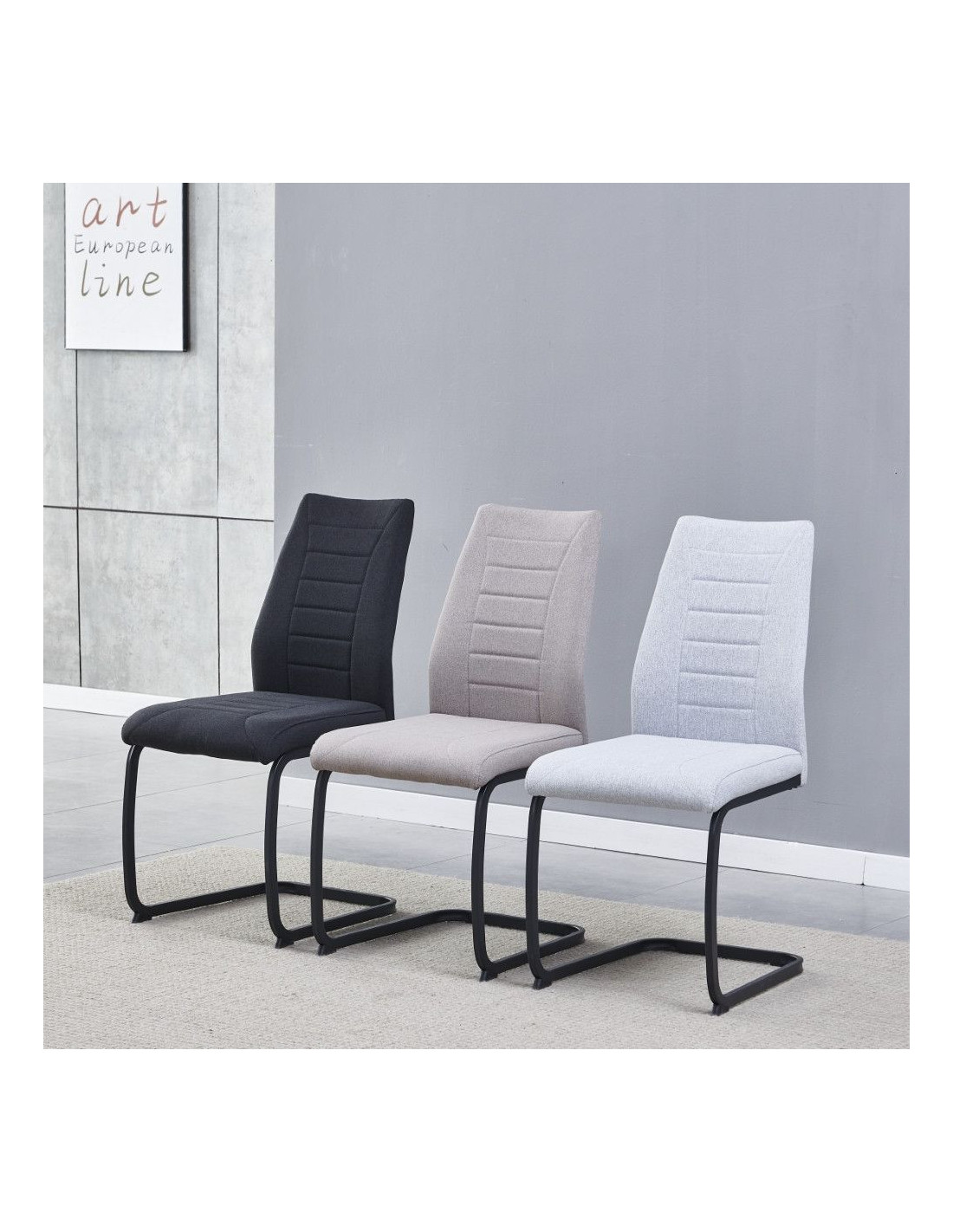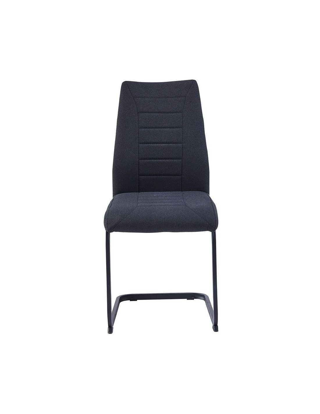 Moderna blagovaonska stolica, ergonomskog dizajna i metalne baze. Sjedalo i naslon stolice presvučeni su mekom tkaninom, prošiveni ukrasnim šavovima i ispunjeni pjenom kako bi se osigurala udobnost čak i pri duljem sjedenju. Visina sjedala je 48 cm od poda. Konzolna baza stolice izrađena je od metalnih cijevi, dimenzija 1,5x2,5 cm, i praškasto je obojena u mat crno kako bi se metal bolje zaštitio od utjecaja okoline.