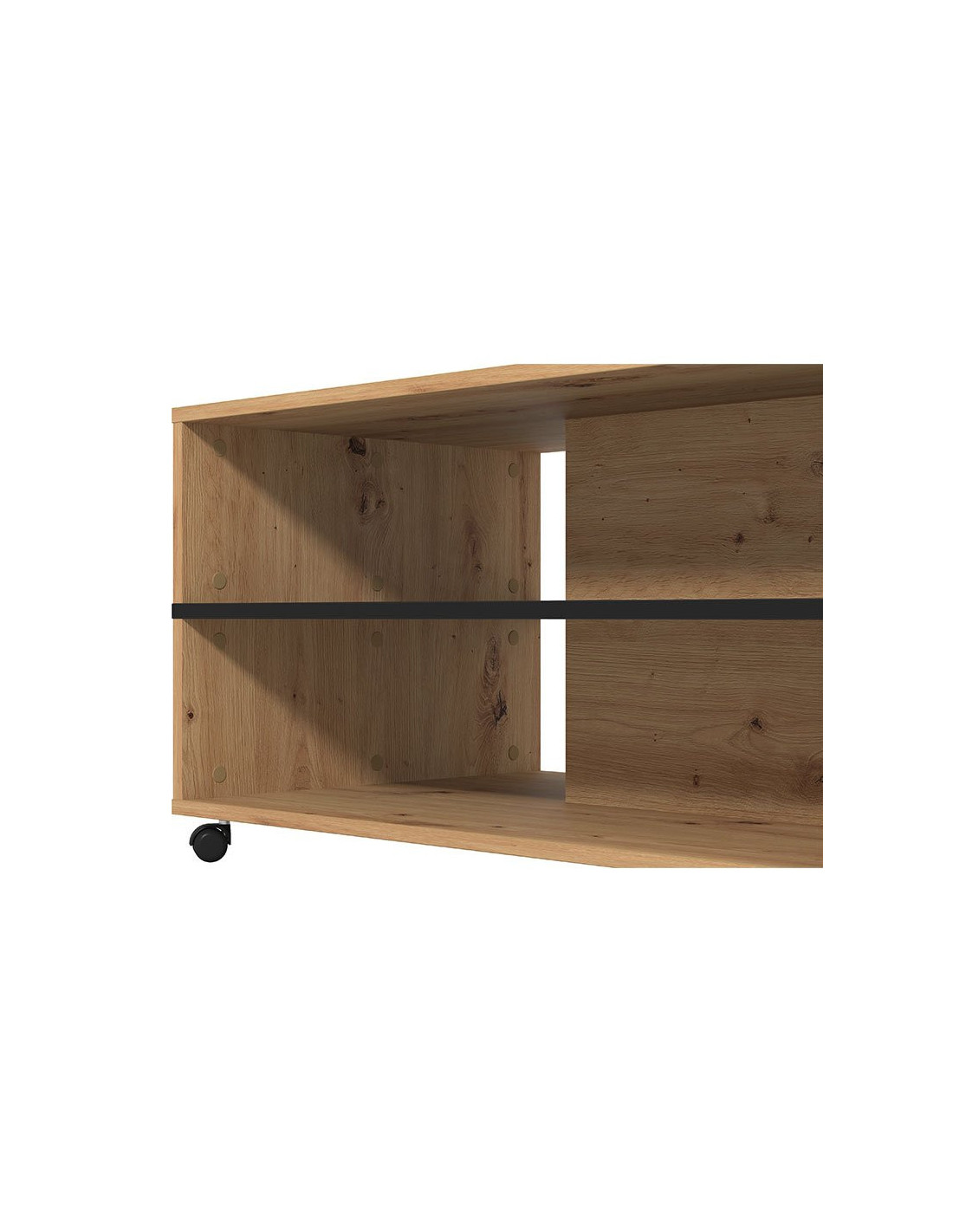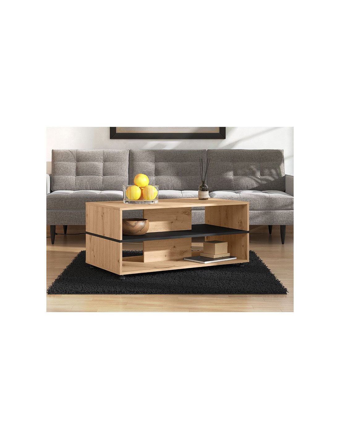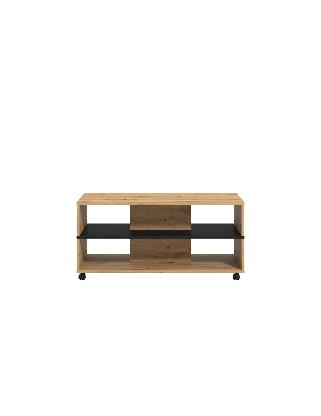 Stolić za kavu SAVIO, u kombinaciji crnog i dekora hrastovog hrasta, ima praktične i estetske prednosti. Dominantan detalj u izgledu ovog klub stolića je efektna polica u kontrastnom dekoru ispod radne površine, pogodna za odlaganje omiljenih knjiga ili časopisa. Stolić za kavu SAVIO doprinosi modernom tematskom konceptu uređenja dnevnog boravka.