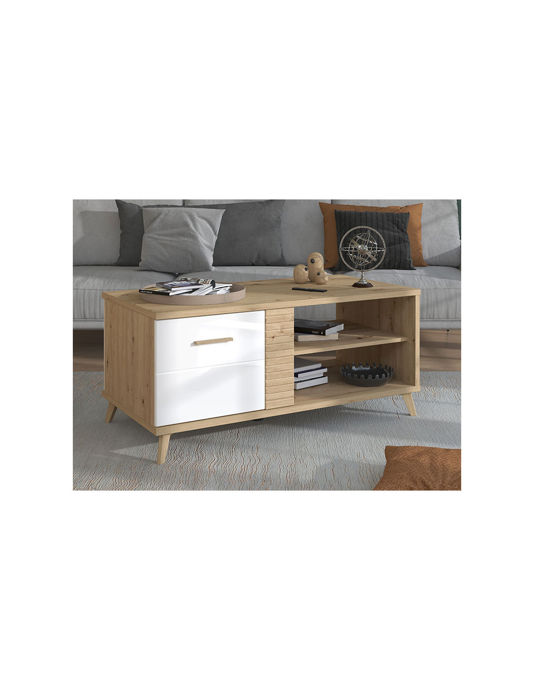 Klub stolić BRETAGNA odličan je funkcionalni dodatak za uređenje dnevnog boravka. Kombinacija dekora hrasta umjetničke izrade sa segmentima u dekoru bijele lakirane folije unosi osvježavajuću estetiku u ambijent. Drvene ručke povezuju dekor u jednu estetsku cjelinu, dok visoke noge naglašavaju njihovu eleganciju.