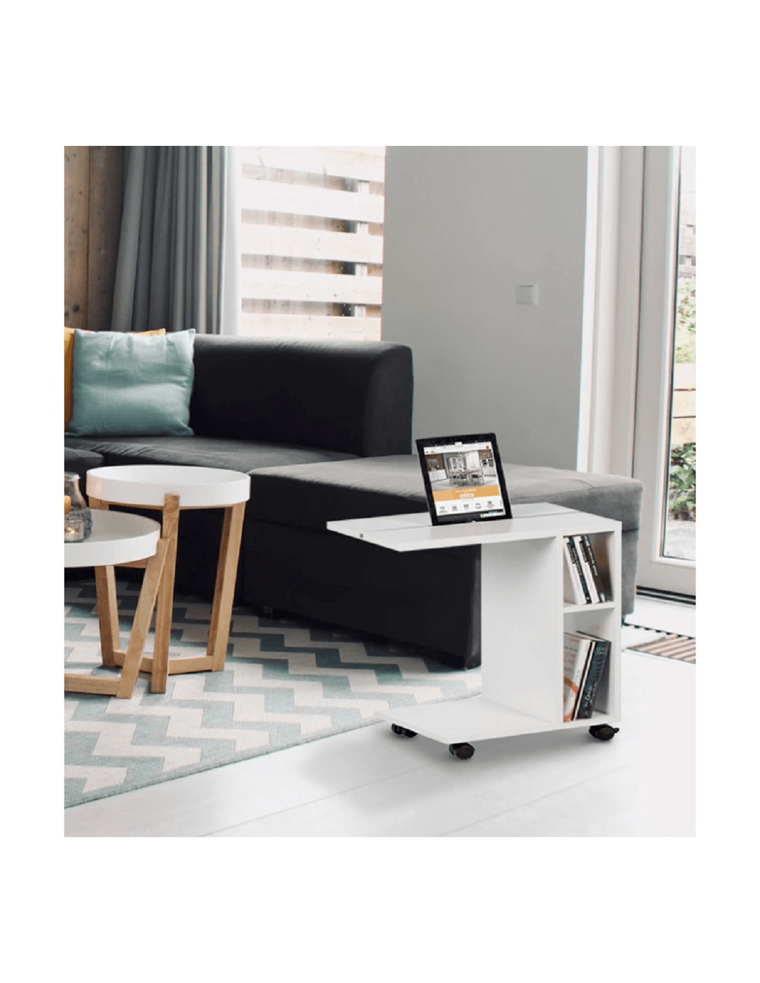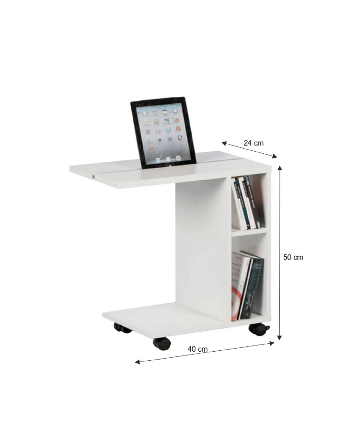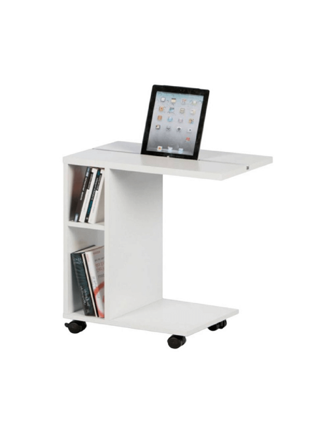 Često radite od kuće? Provodite li slobodno vrijeme za tabletom? Ne znate kako sjesti i stalno držati tablet u ruci? Je li vam stolica neudobna i umorni ste od sjedenja na kauču? NIDEN pomoćni stolić je savršen za vas. Gdje god odlučite raditi, može ići s vama. To omogućuju kotačići, koji olakšavaju rukovanje. Velika prednost je urez za tablet i dvije police prikladne za pohranu knjiga, časopisa ili radnog materijala. Izrađen je od visokokvalitetne iverice u bijeloj završnoj obradi. Uz NIDEN stol, život će biti ljepši, a rad lakši.