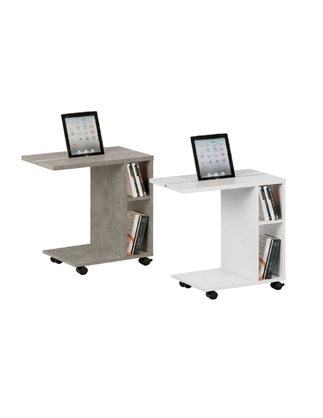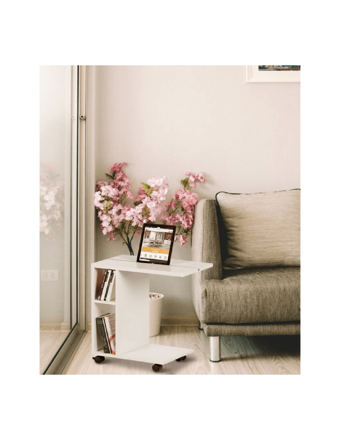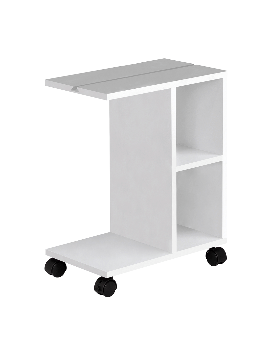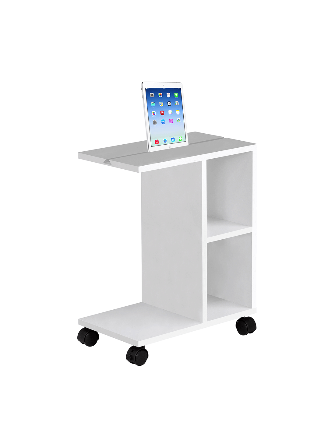 Često radite od kuće? Provodite li slobodno vrijeme za tabletom? Ne znate kako sjesti i stalno držati tablet u ruci? Je li vam stolica neudobna i umorni ste od sjedenja na kauču? NIDEN pomoćni stolić je savršen za vas. Gdje god odlučite raditi, može ići s vama. To omogućuju kotačići, koji olakšavaju rukovanje. Velika prednost je urez za tablet i dvije police prikladne za pohranu knjiga, časopisa ili radnog materijala. Izrađen je od visokokvalitetne iverice u bijeloj završnoj obradi. Uz NIDEN stol, život će biti ljepši, a rad lakši.
