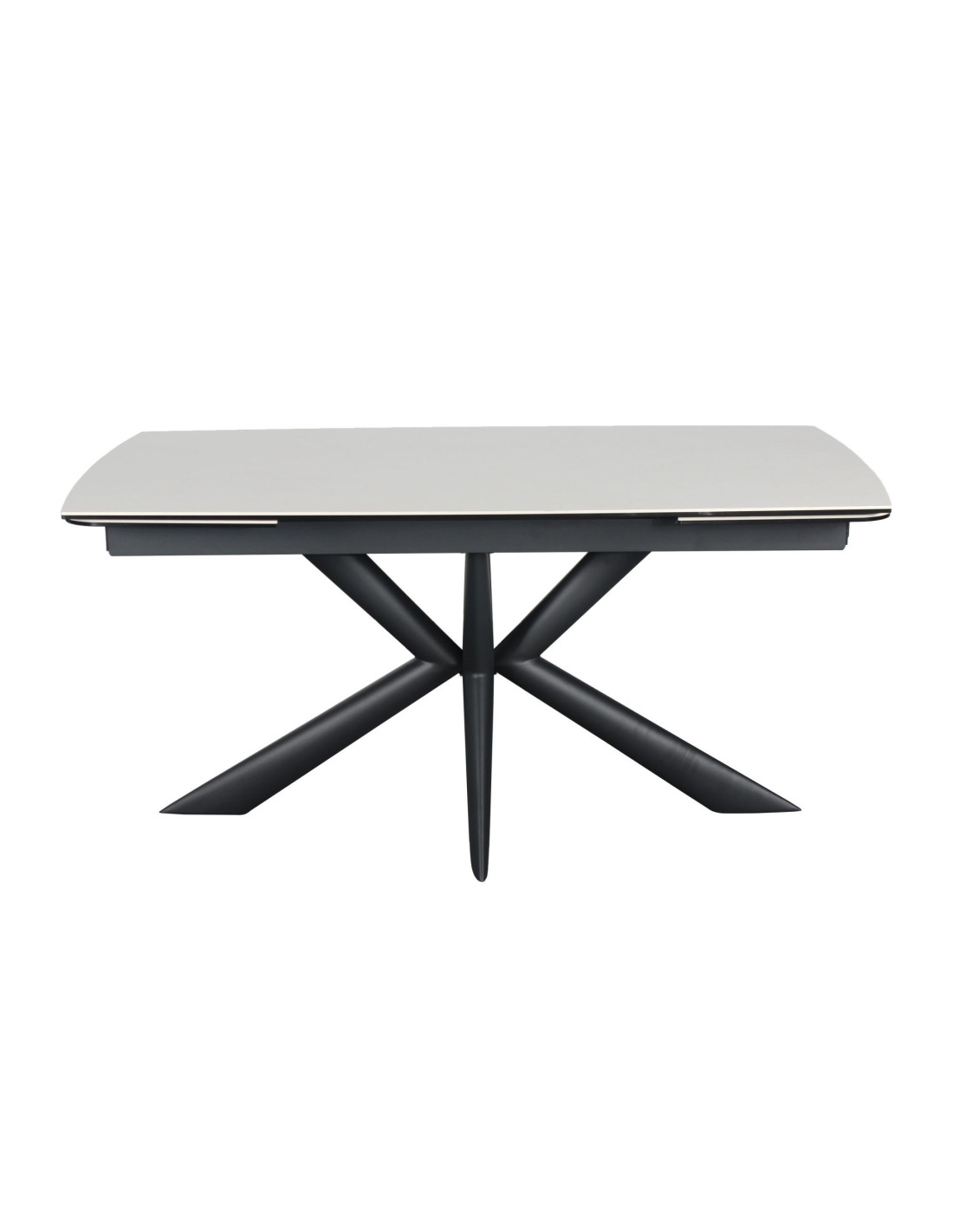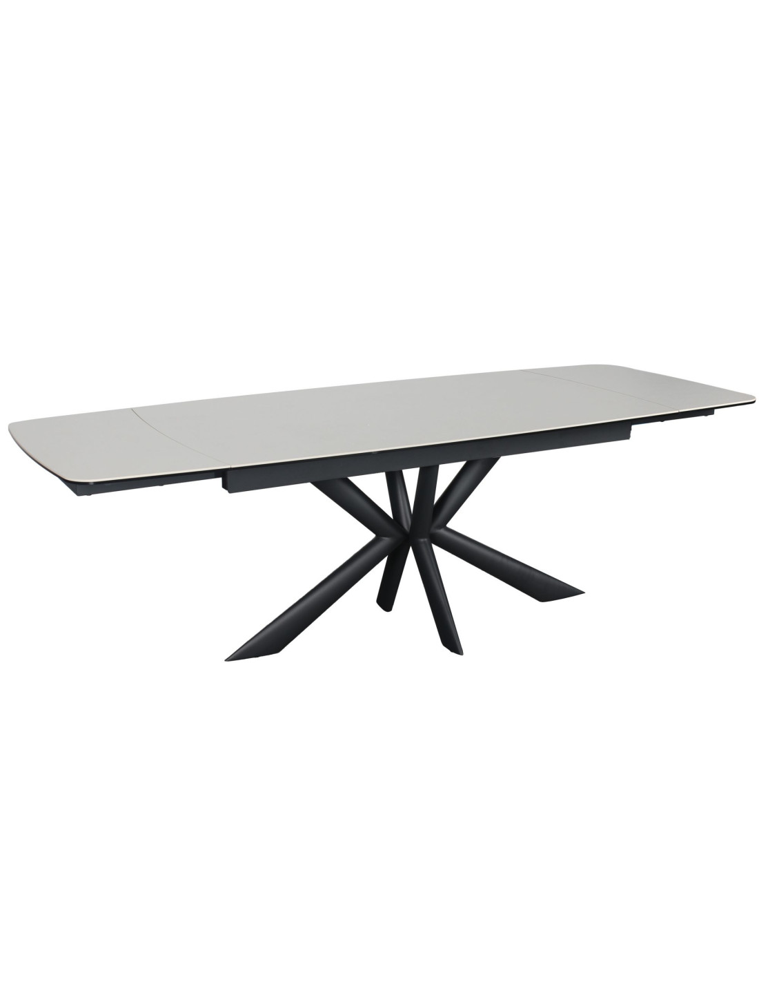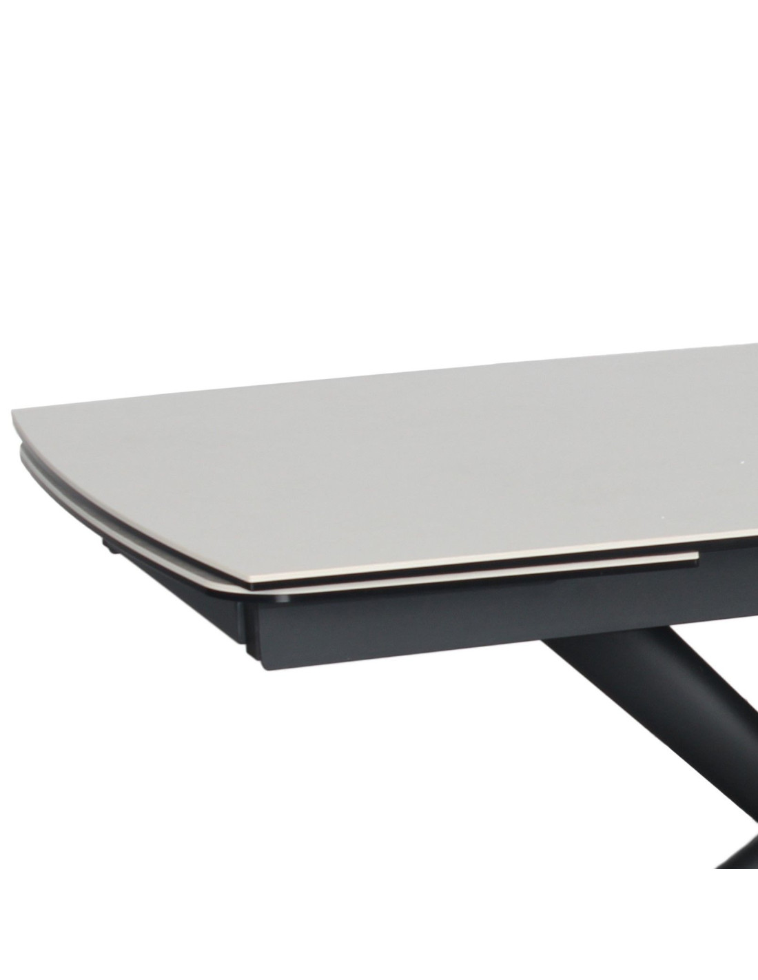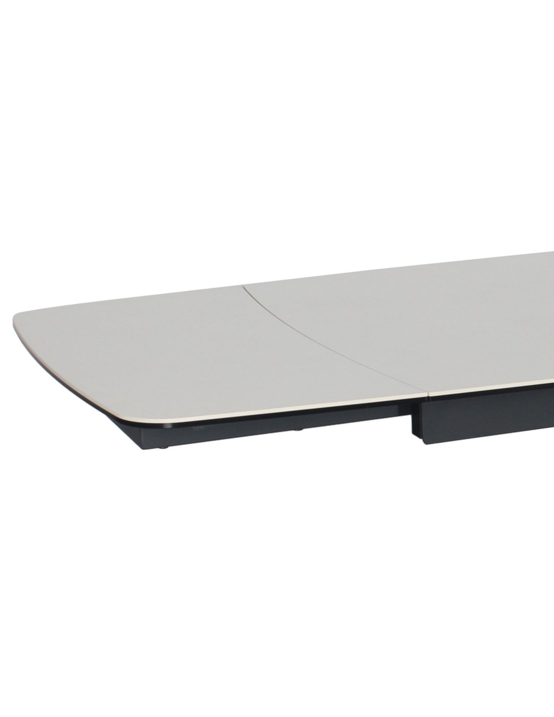 Ploča stola kombinira dva materijala, sloj kaljenog stakla debljine 8 mm spojen s keramikom debljine 6 mm u bijeloj boji. Ova kombinirana površina od dva različita materijala pruža izvrsnu otpornost na toplinsko širenje, mrlje od hrane i tekućine te fizičke ogrebotine.Zaobljeni kutovi na glavnoj ploči stola i produžecima povećavaju sigurnost, posebno u domovima s djecom, a istovremeno doprinose elegantnom izgledu i suvremenom dizajnu stola.Stol stoji na crnoj metalnoj podlozi s praškastim premazom za otpornost na koroziju i okoliš. Radijalni dizajn nogu osigurava optimalnu stabilnost, a istovremeno nudi puno prostora za noge sa svih strana.