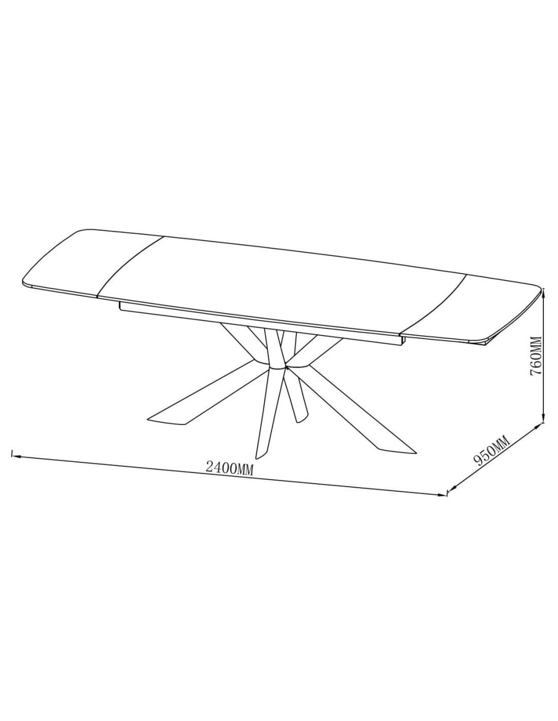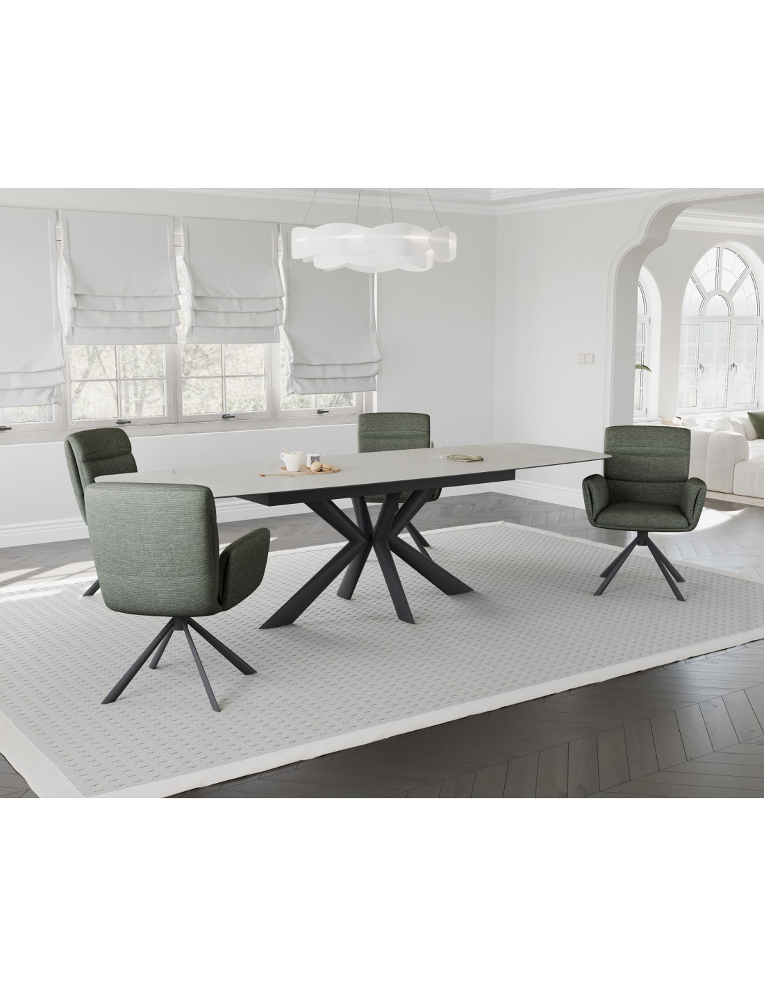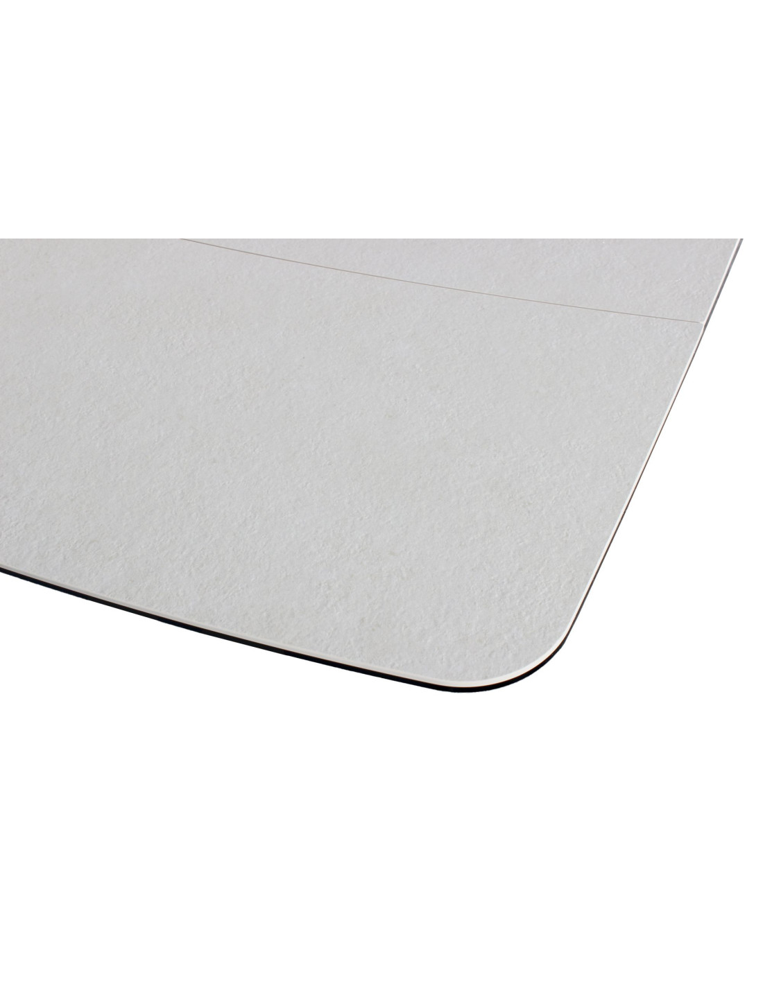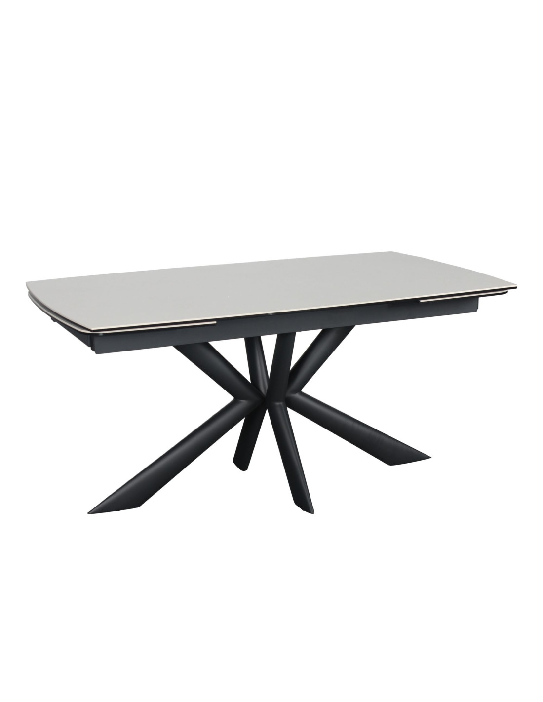 Ploča stola kombinira dva materijala, sloj kaljenog stakla debljine 8 mm spojen s keramikom debljine 6 mm u bijeloj boji. Ova kombinirana površina od dva različita materijala pruža izvrsnu otpornost na toplinsko širenje, mrlje od hrane i tekućine te fizičke ogrebotine.Zaobljeni kutovi na glavnoj ploči stola i produžecima povećavaju sigurnost, posebno u domovima s djecom, a istovremeno doprinose elegantnom izgledu i suvremenom dizajnu stola.Stol stoji na crnoj metalnoj podlozi s praškastim premazom za otpornost na koroziju i okoliš. Radijalni dizajn nogu osigurava optimalnu stabilnost, a istovremeno nudi puno prostora za noge sa svih strana.