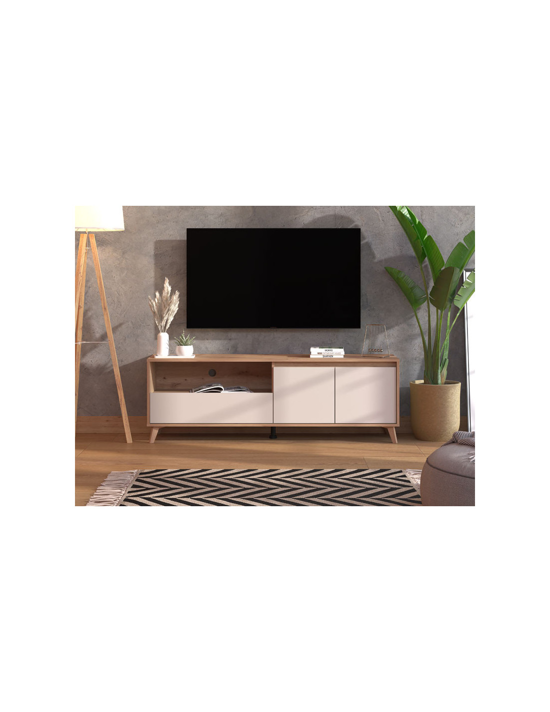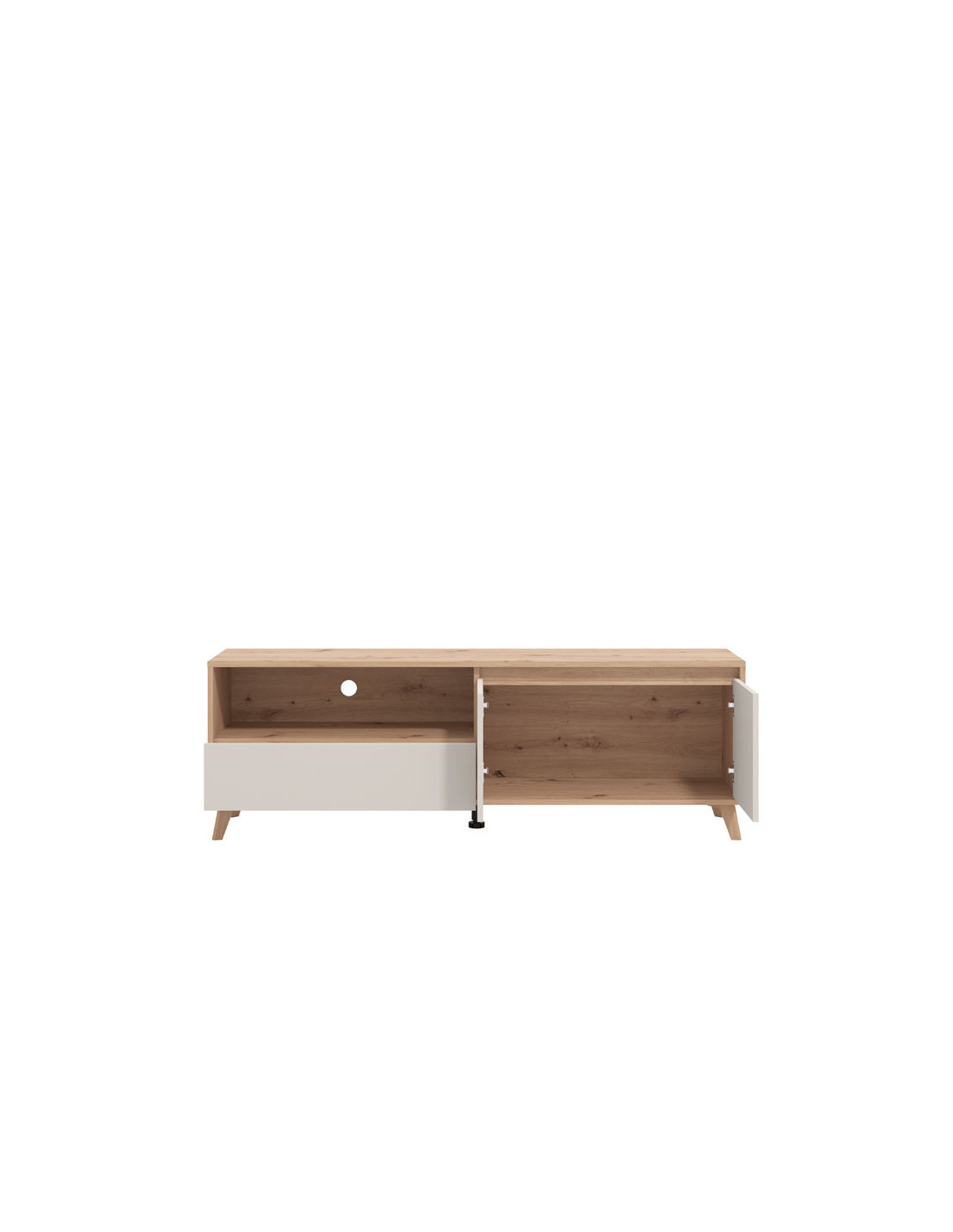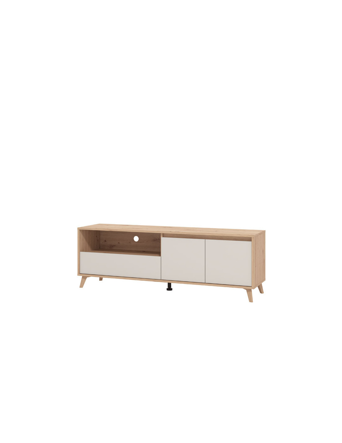 TV polica STIRLING TV 157 3K1F2V izrađena je u kombinaciji dekora artisan hrasta, kašmir dekora i artisan hrast folije, koji unosi osvježavajuću estetiku u ambijent. Drveni podignuti nogari ističu ovaj model TV policije i doprinose njenoj kompletnoj estetici. Dva zatvorena segmenta, praktična ladica, kao i otvorena polica, efektno doprinose funkcionalnoj organizaciji dnevnog boravka.