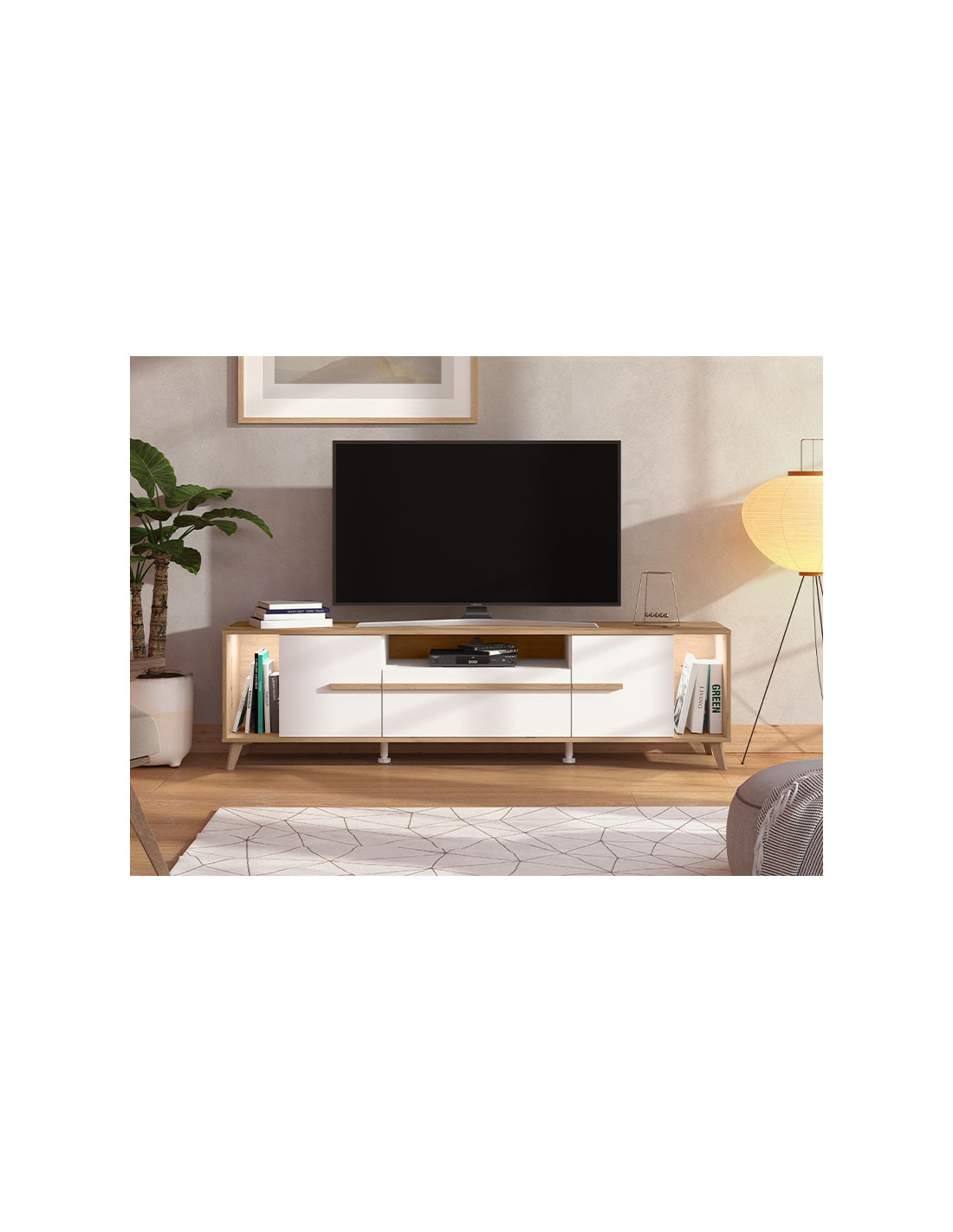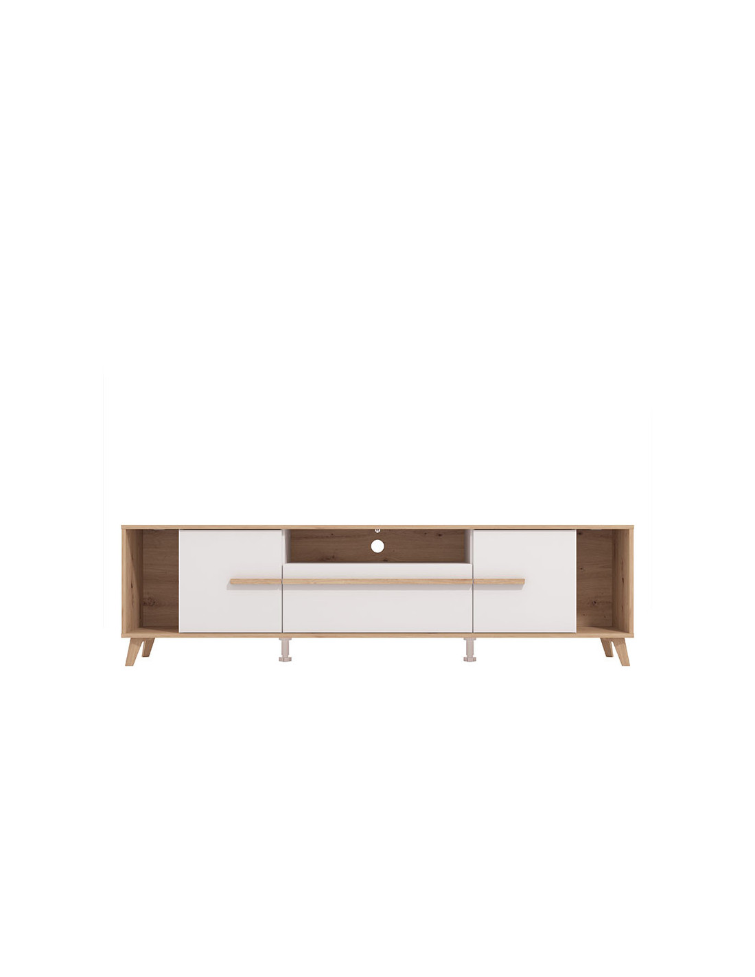 TV polica ORLEANS je sjajan funkcionalni dodatak za uređenje ambijenta dnevnog boravka. Kombinacija bijelog dekora, artisan hrasta i artisan hrastove folije, unosi osvježavajuću estetiku u ambijent. Dva zatvorena segmenta, praktična ladica, kao i otvoreni segmenti, efektno doprinose funkcionalnoj organizaciji TV kutka. Postoji mogućnost dodavanja rasvjete.
