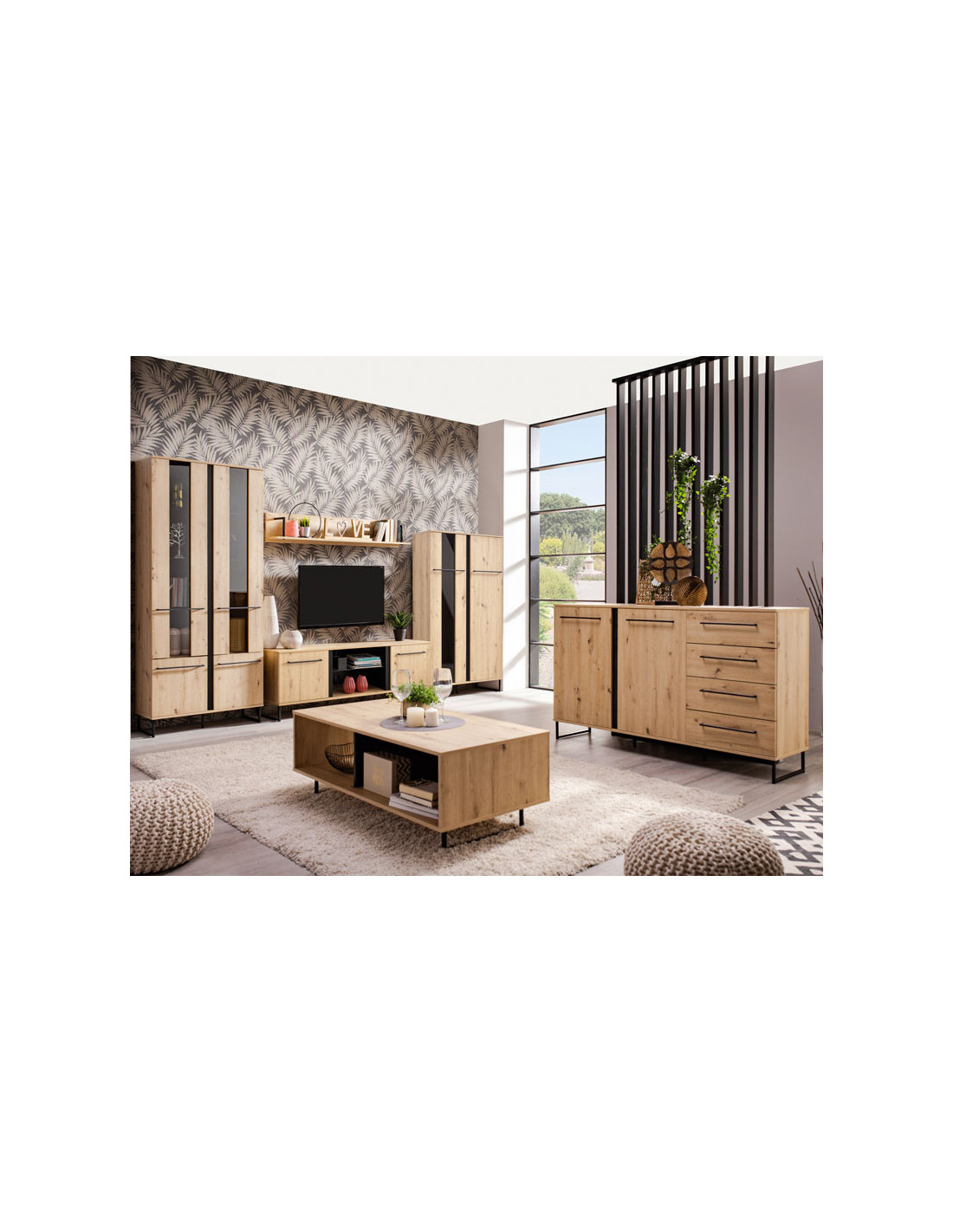 TV polica SARDINIA TV 170 kombinacija je topline prirodnog i rustikalnog hrasta s upotrebom suptilnih crnih dekorativnih elemenata, kao karakteristika industrijskog stila u uređenju interijera. Dva zatvorena bočna segmenta, kao i otvoreni dio sa staklenom policom, učinkovito doprinose funkcionalnoj organizaciji dnevnog boravka. Dio je istoimene kolekcije SARDINIA, s kojom tvori unutarnju cjelinu, a koja u vaš dom unosi odraz autentičnog i smjelog načina života. Postoji mogućnost ugradnje dodatne rasvjete.