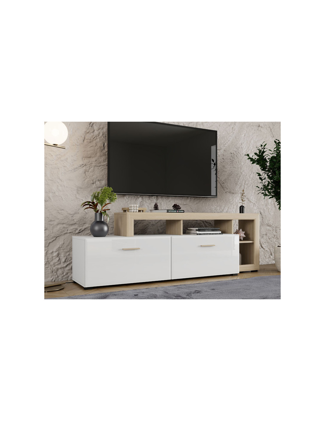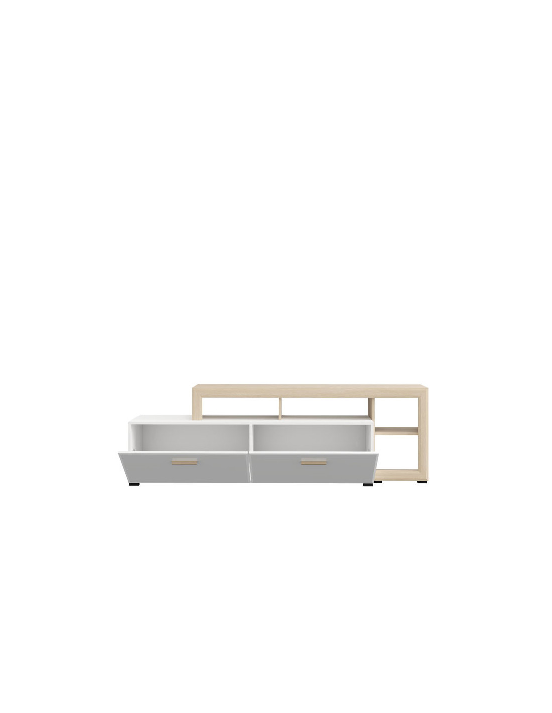 TV polica CARLOW TV 189 2K2V funkcionalan je i estetski upečatljiv element za opremanje dnevnog boravka. Kombinacija neprozirno bijelog dekora, svijetlog port hrasta, bijele lak folije i svijetle port hrast folije unosi osjećaj topline i vizualne ravnoteže u prostor, čineći ovaj element lakim za uklapanje u različite koncepte interijera. Dvije zatvorene pregrade i atraktivno postavljene otvorene police omogućuju praktičnu organizaciju multimedijskih uređaja i dekorativnih detalja, a istovremeno postiže skladan i jasan izgled.