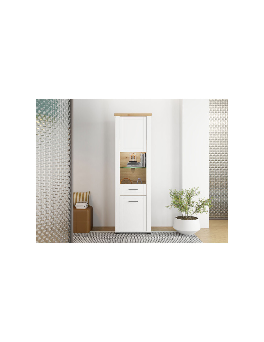 Vitrina VALENCIA 1K VS1 u kombinaciji dekora artisan hrasta, neprozirne bijele i bijele mat folije dizajnerski je atraktivno rješenje za uređenje dnevnog boravka koje daje topliju estetiku interijeru. Korisni prostor sastoji se od jednog zatvorenog i jednog ostakljenog dijela koji u sebi ima praktično raspoređene police za odlaganje stvari. Fronte su obogaćene crnim ručkama jednostavnog dizajna koje su u skladu s dizajnerskom linijom cijele kolekcije.