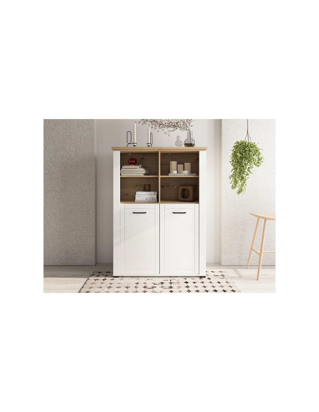 Vitrina VALENCIA 2K VS2 u kombinaciji dekora artisan hrasta, neprozirne bijele i bijele mat folije dizajnerski je atraktivno rješenje za uređenje dnevnog boravka koje daje topliju estetiku interijeru. Korisni prostor sastoji se od dva zatvorena i dva ostakljena dijela koji u sebi imaju praktično raspoređene police za odlaganje stvari. Fronte su obogaćene crnim ručkama jednostavnog dizajna koje su u skladu s dizajnerskom linijom cijele kolekcije.