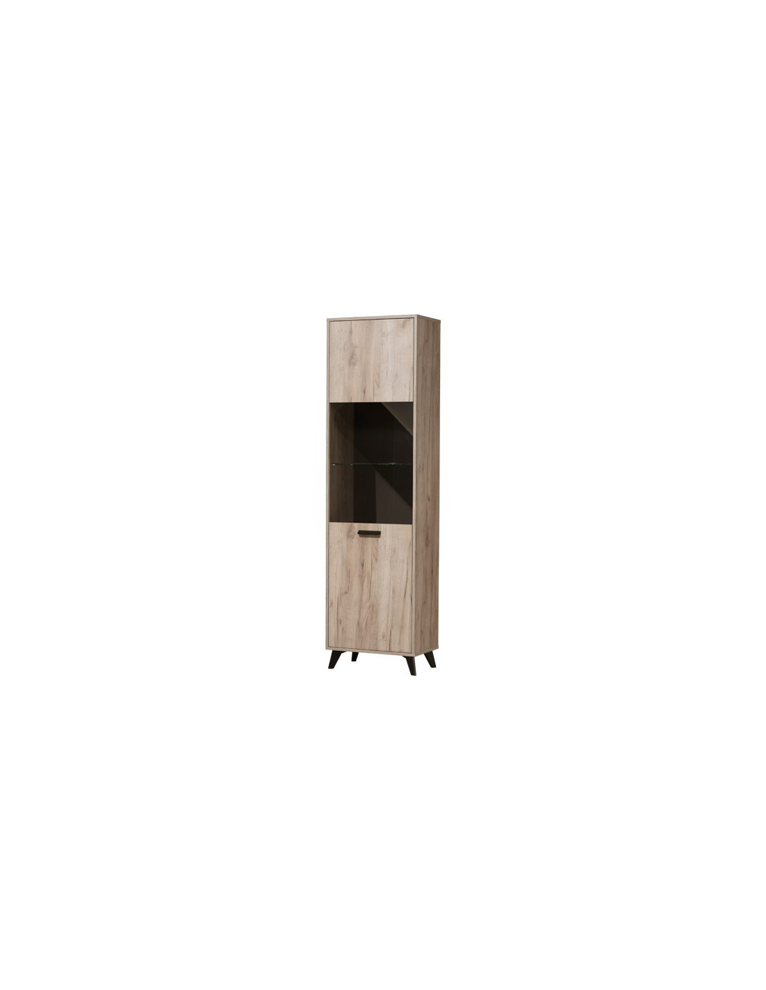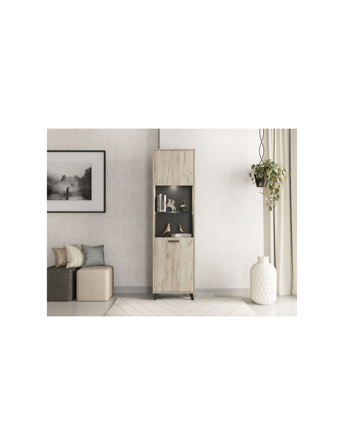 Vitrina UMBRIA 1K VS, u kombinaciji dekora sivog hrasta i crnog drva, dio je iste kolekcije koja će doprinijeti opremanju vašeg doma prema najnovijim standardima uređenja interijera. Sastoji se od zatvorenog, poluostakljenog segmenta u koji po želji možete dodati LED rasvjetu.