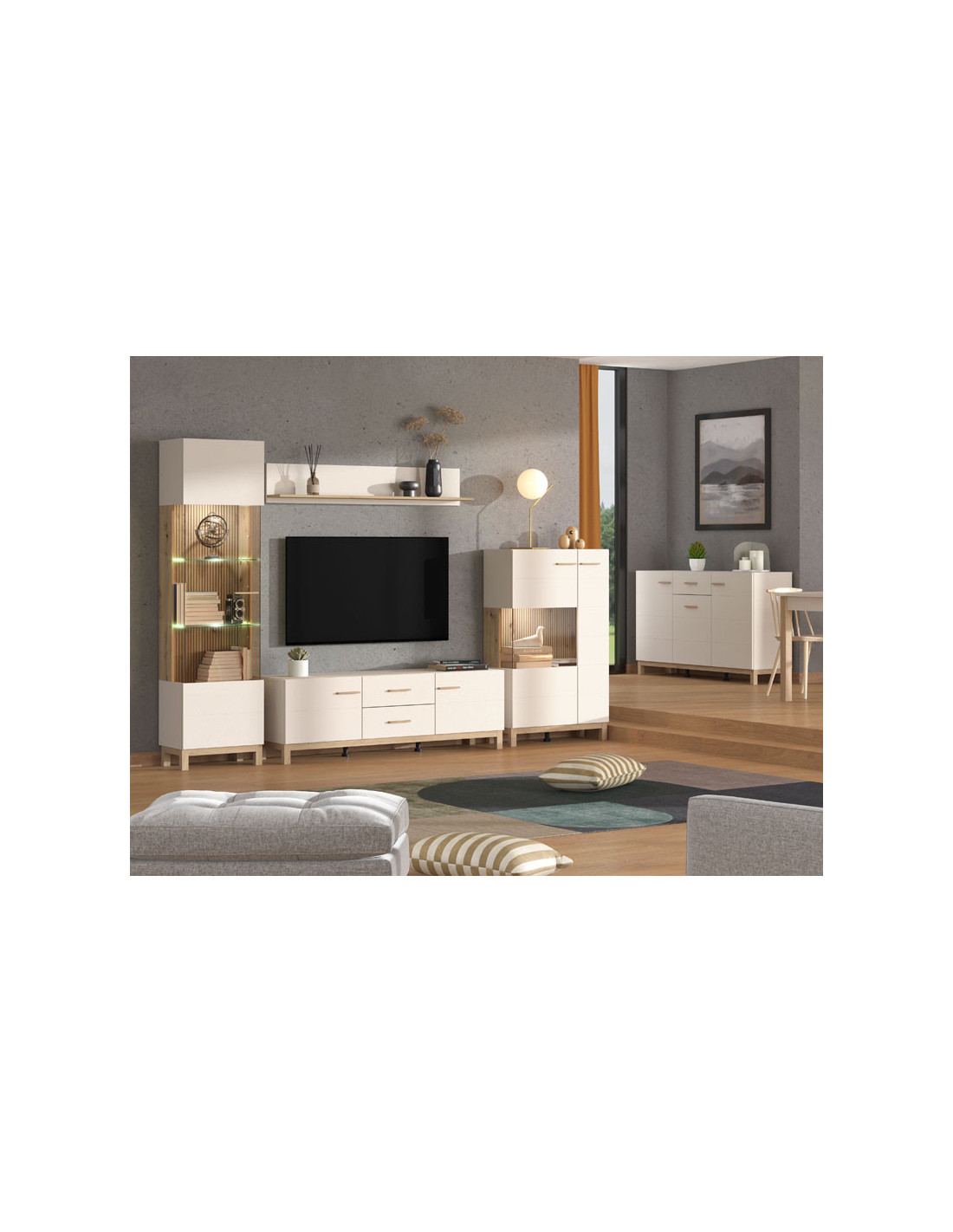 Vitrina ESSEX 2K VS1 127 funkcionalan je dodatak za opremanje dnevnog boravka. Kombinacija dekora kašmira i dekora hrasta umjetnika s crnim prugama unosi u prostor notu sofisticiranog stilskog izričaja koji je potreban u suvremenim interijerima. Dio je istoimenog sustava elemenata za uređenje ambijenta dnevnog boravka, koji predstavlja moderno rješenje za stiliziranje ambijenta doma. Postoji mogućnost dodavanja rasvjete.