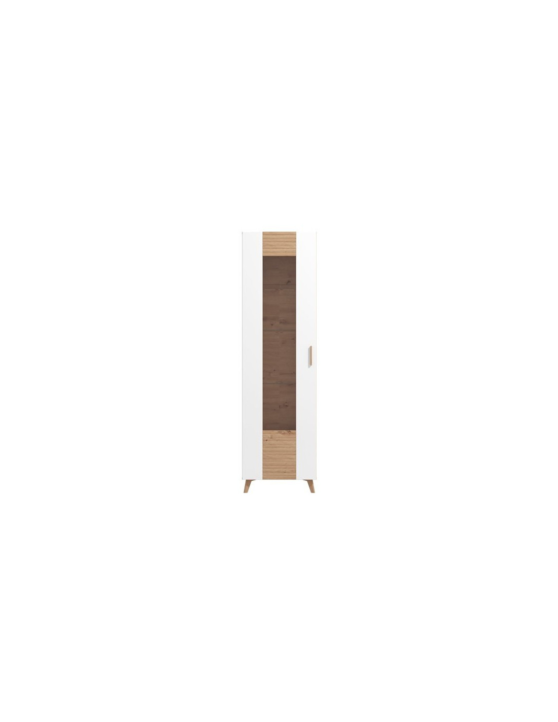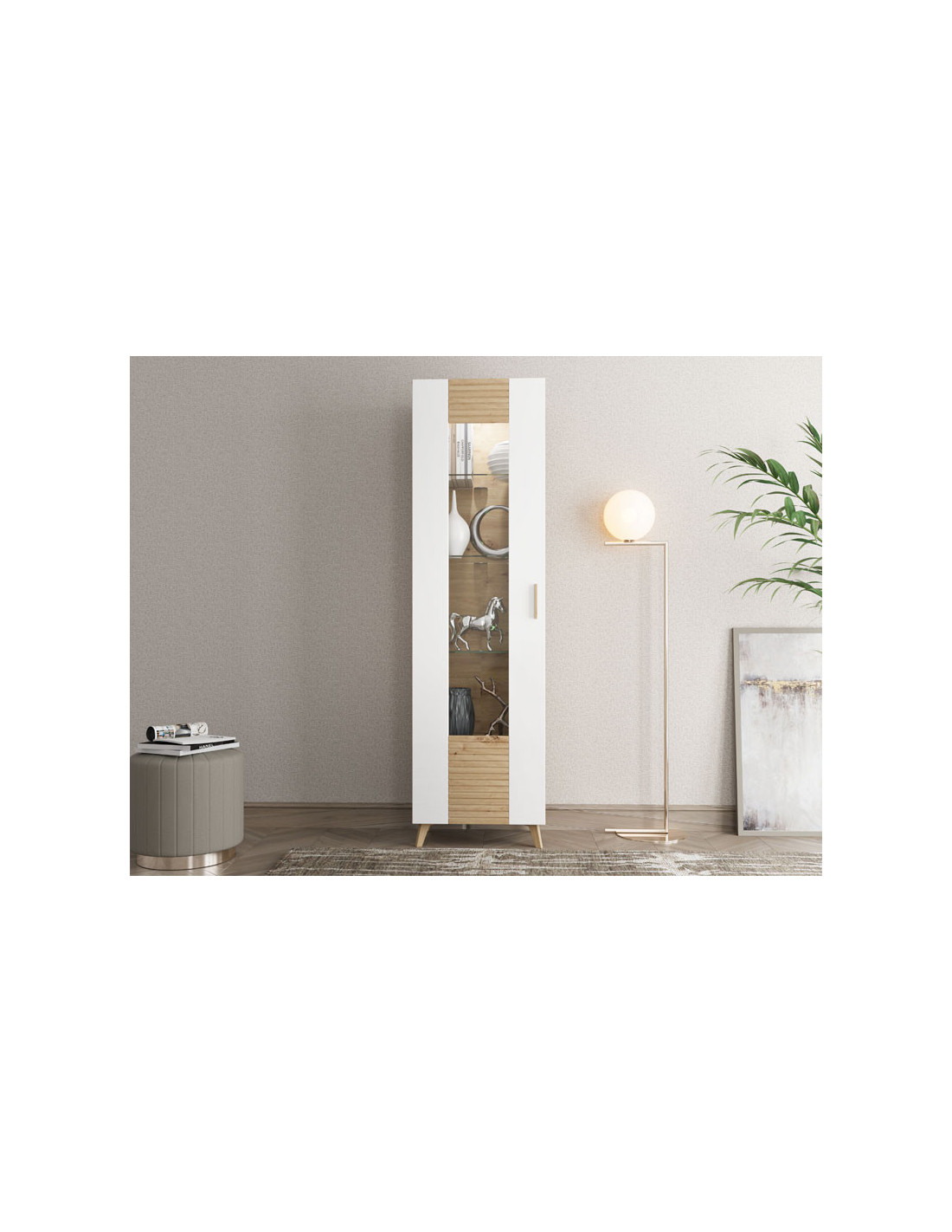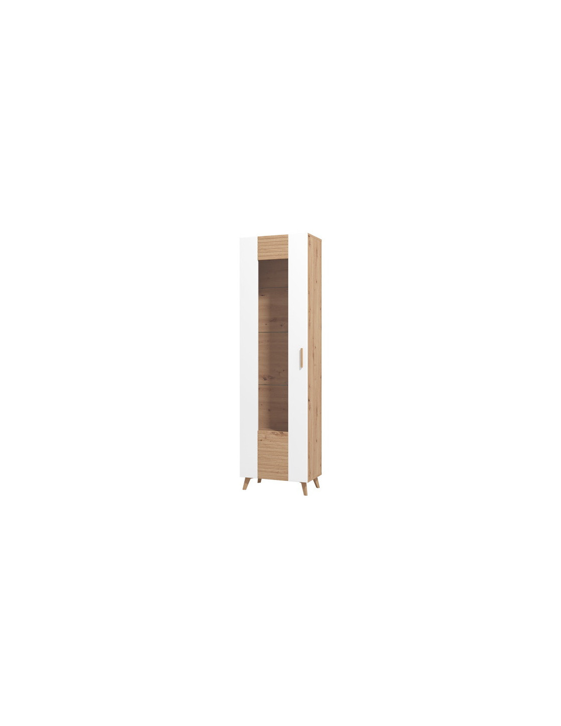Vitrina BRETAGNA 1K VS1 izrađena je u kombinaciji dekora artisan hrasta sa segmentima u dekoru bijele lak folije, kao i artisan hrast folije, što u okoliš unosi osvježavajuću estetiku. Drvene ručke povezuju dekor u jednu estetsku cjelinu, dok visoke noge naglašavaju njihovu eleganciju. Funkcionalnosti ovog elementa doprinosi praktično uređen iskoristivi prostor. Postoji mogućnost dodavanja rasvjete. Dio je istoimenog sustava elemenata za uređenje ambijenta dnevnog boravka, koji se odlikuju karakteristikama modernog dizajna u kombinaciji s profinjenom notom elegancije.