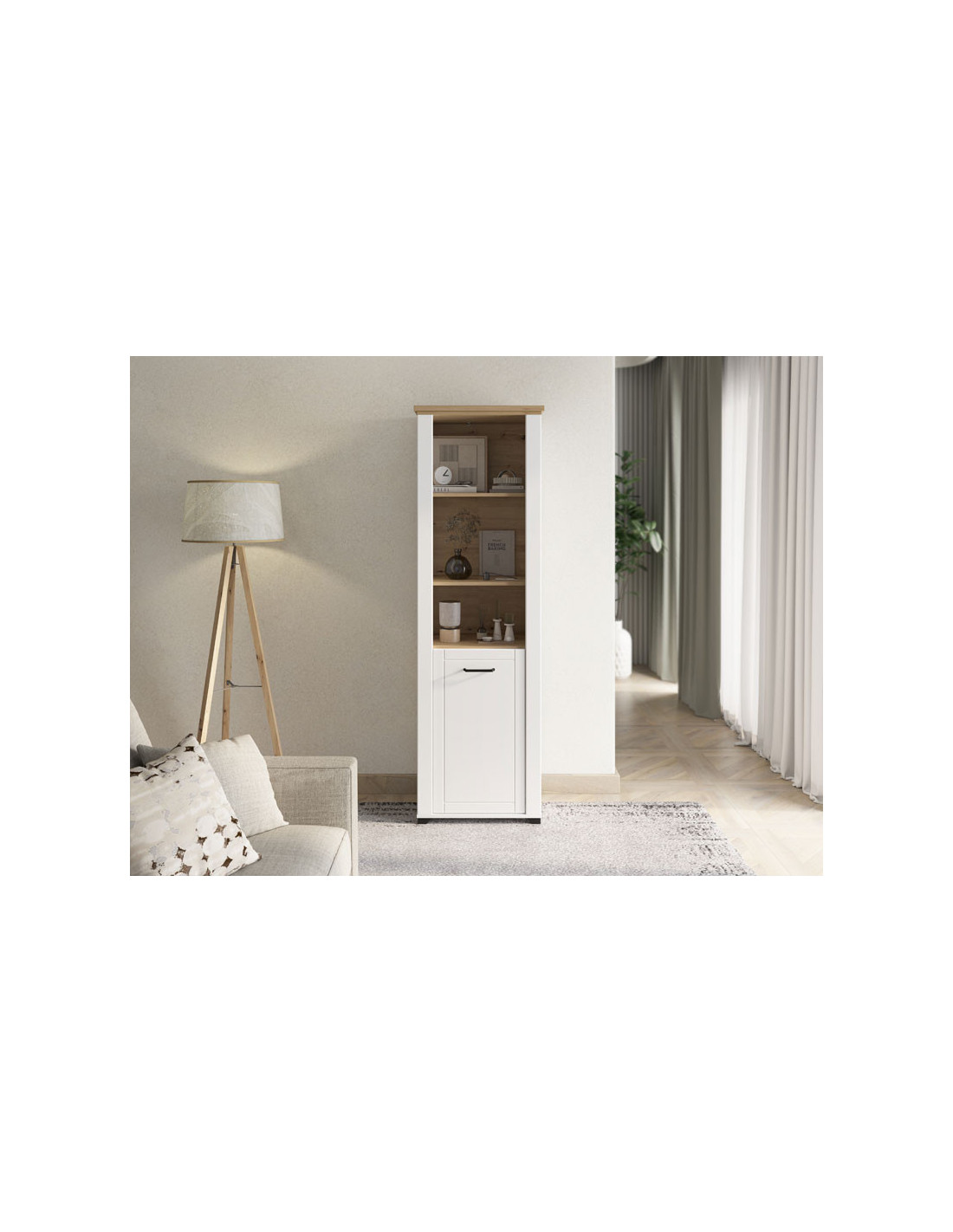 Vitrina VALENCIA POP 1K u kombinaciji dekora artisan hrasta, bijele boje i bijele mat folije, atraktivno je dizajnersko rješenje za uređenje dnevnog boravka, koje daje topliji estetski interijer. Korisni prostor sastoji se od otvorenog dijela s policama i zatvorenog dijela, koji unutra ima praktično raspoređene police za odlaganje. Fronte su obogaćene crnim ručkama jednostavnog dizajna, koje su usklađene s dizajnerskom linijom cijele kolekcije. Pripada istoimenom sustavu elemenata VALENCIA, koji se odlikuje funkcionalnošću i praktičnošću, čemu doprinosi i veliki broj elemenata u sustavu i izvrsna organizacija prostora za odlaganje.