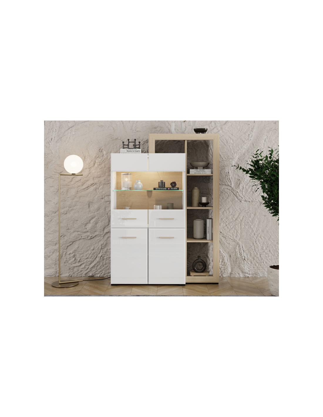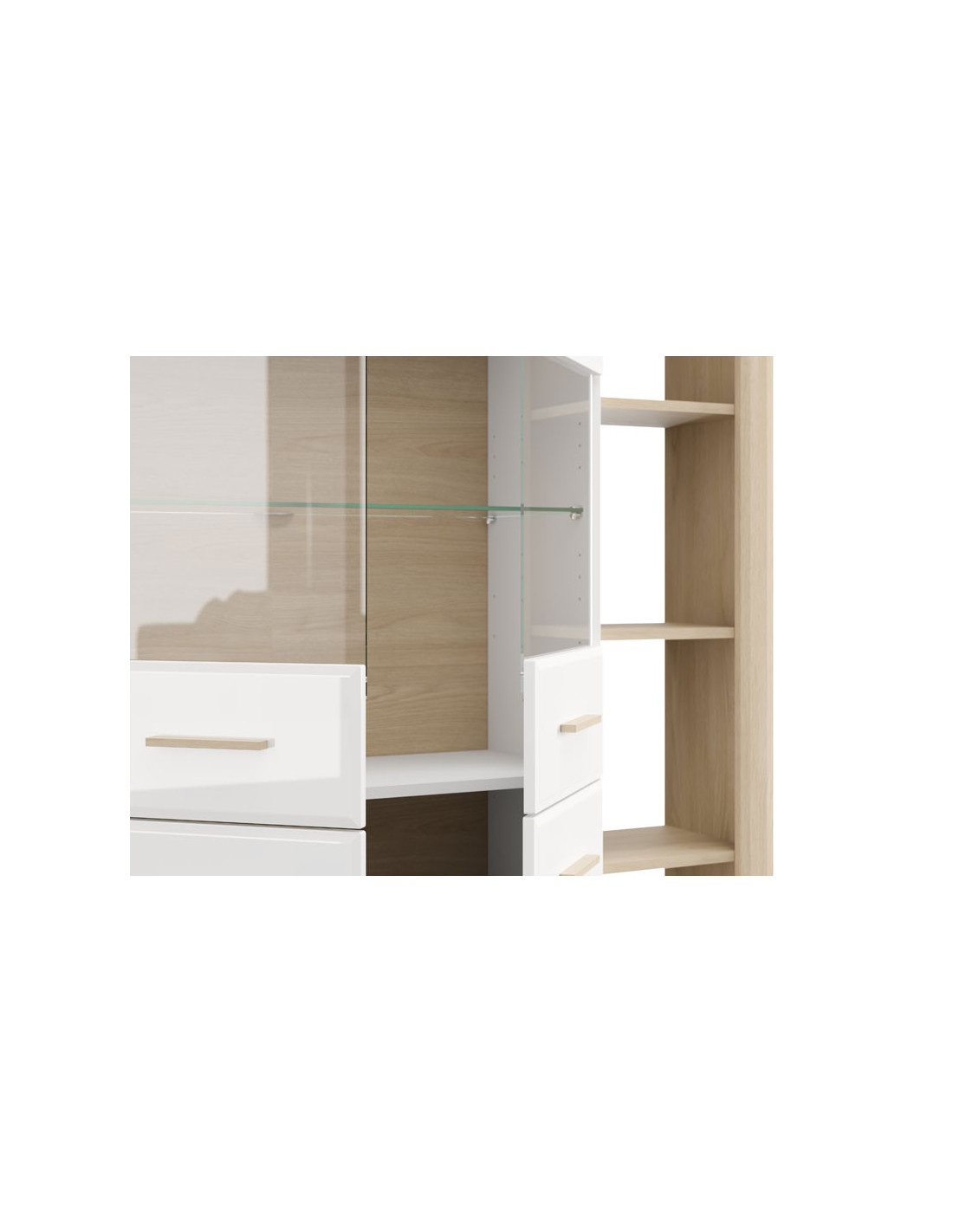 Vitrina CARLOW 2K VS2 OP 157 je elegantan i funkcionalan samostojeći dvokrilni element za opremanje dnevnog boravka, dizajniran da istakne suvremeni karakter interijera. Kombinacija neprozirno bijelog dekora, svijetlog port hrasta, bijele lak folije i svijetle port hrast folije unosi toplinu i vizualnu ravnotežu u prostor, uz skladnu kombinaciju modernih i prirodnih elemenata. Poluostakljene fronte doprinose atraktivnom izgledu vitrine i omogućuju diskretno izlaganje ukrasnih predmeta, dok zatvoreni segmenti pružaju praktičan prostor za pohranu. Postoji mogućnost ugradnje dodatne LED rasvjete.