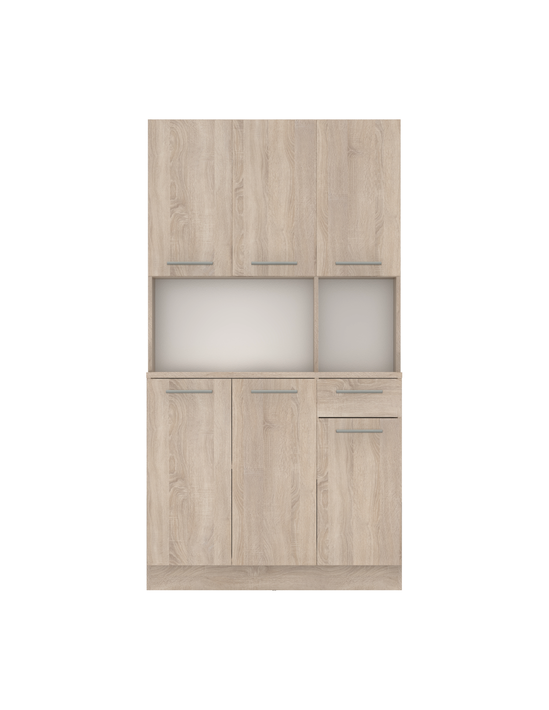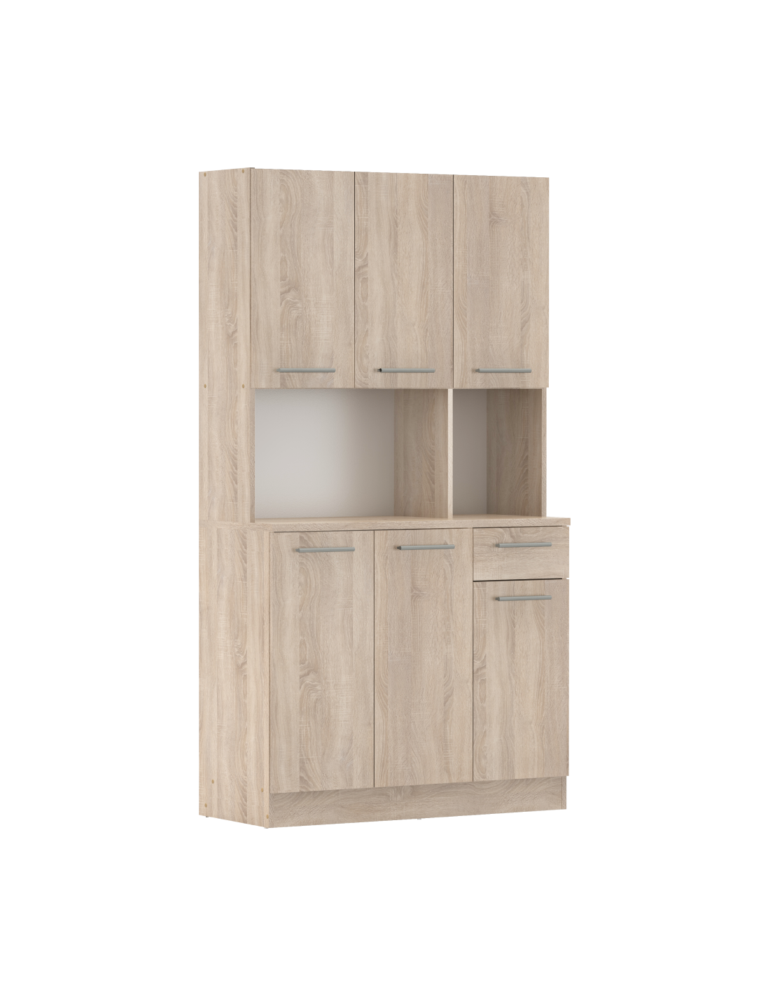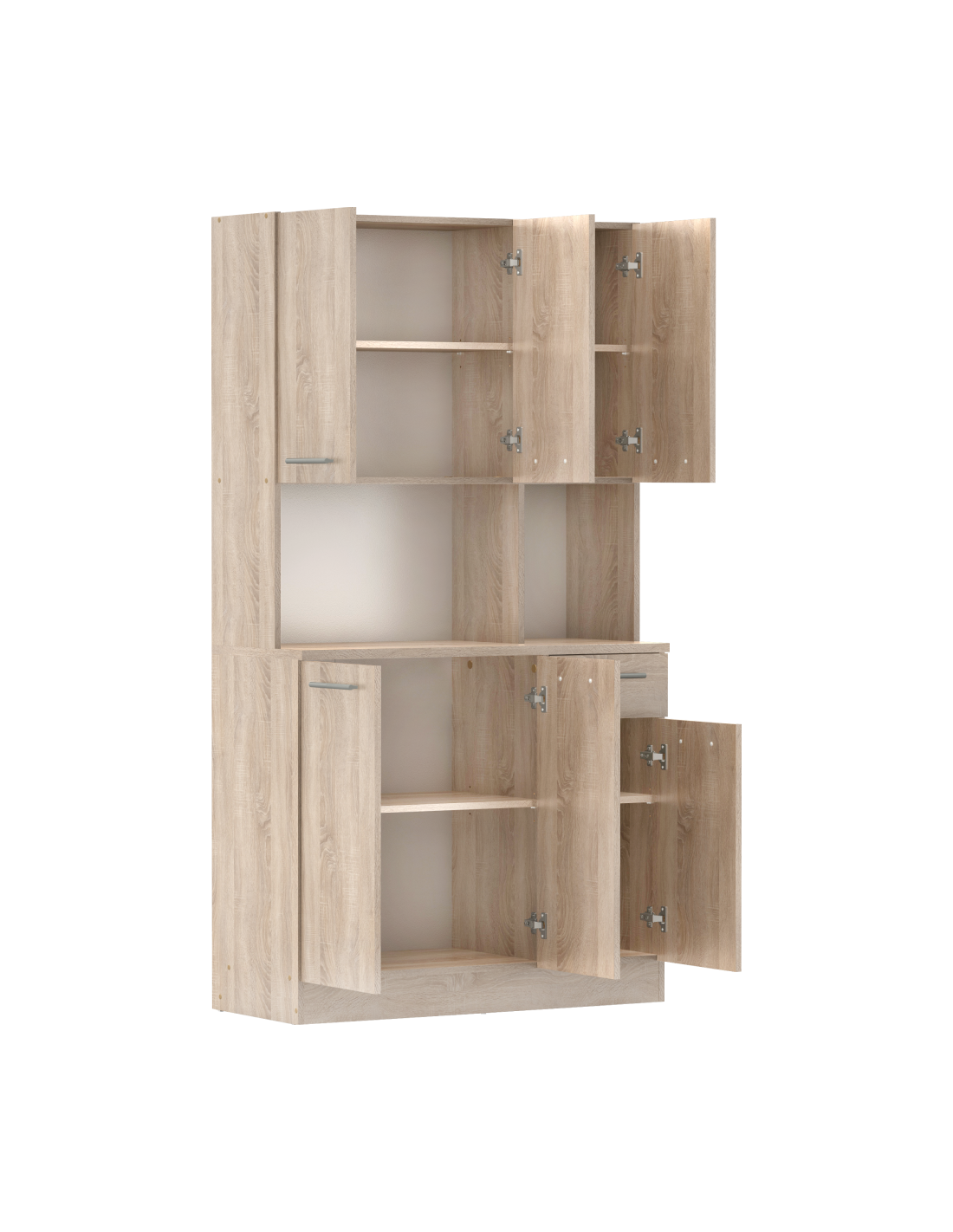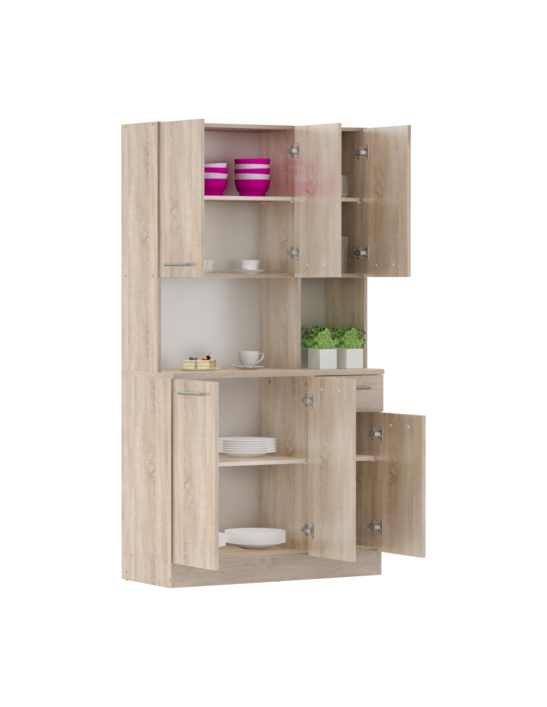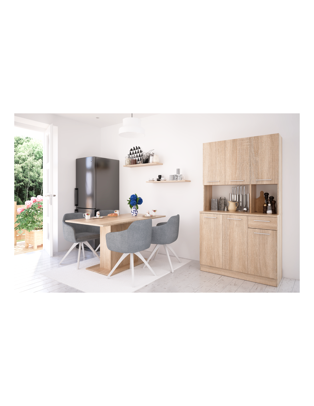 Doživite radost savršeno organizirane kuhinje s našim PELION NEW kredencom sa šest vrata! Izrađen je od laminiranog DTD-a u elegantnoj završnoj obradi hrasta Sonoma, koja će prostoru dati svježinu i lakoću. Dizajniran je da postane vaš nezamjenjivi pomagač u kuhinji, blagovaonici ili vrtnoj sjenici. Nudi šest prostranih vrata i jednu ladicu, što će vam pružiti dovoljno prostora za uredno spremanje kuhinjskog pribora, ukrasa ili drugih sitnica. Moderne srebrne PVC ručke jamče udobno otvaranje, dok plastični klizači štite vaš pod i osiguravaju stabilnost čak i na neravnim površinama. PELION NEW idealno je rješenje za one koji traže kombinaciju funkcionalnosti, stila i praktičnog prostora za pohranu.