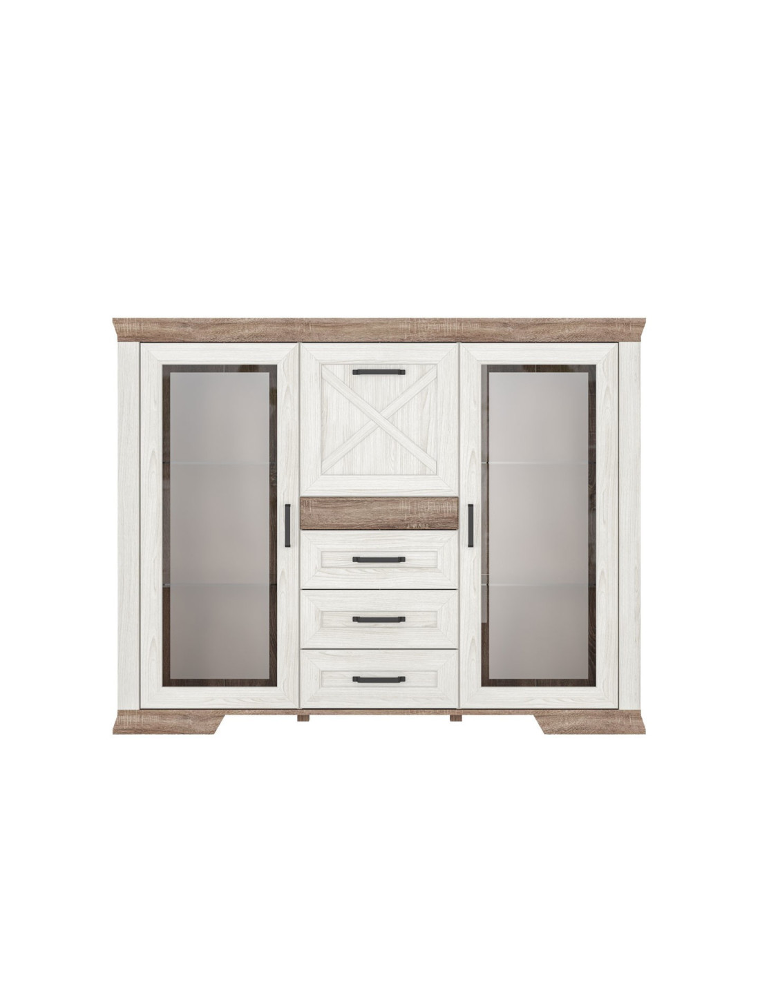 Regal Marselle vrlo eleganotnog izgleda. U kombinaciji bijele i smeđe boje. Dodatnu eleganciju daju metalne ručkice crne boje. Komoda se sastoji od 2 staklena vrata, 3 ladice i 1 vrata koja se otvaraju prema dolje.