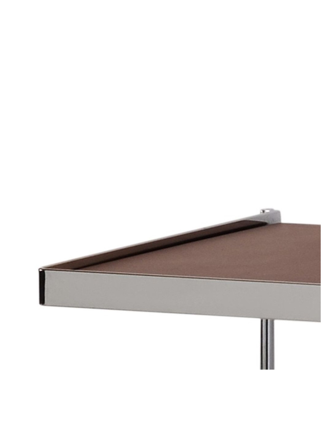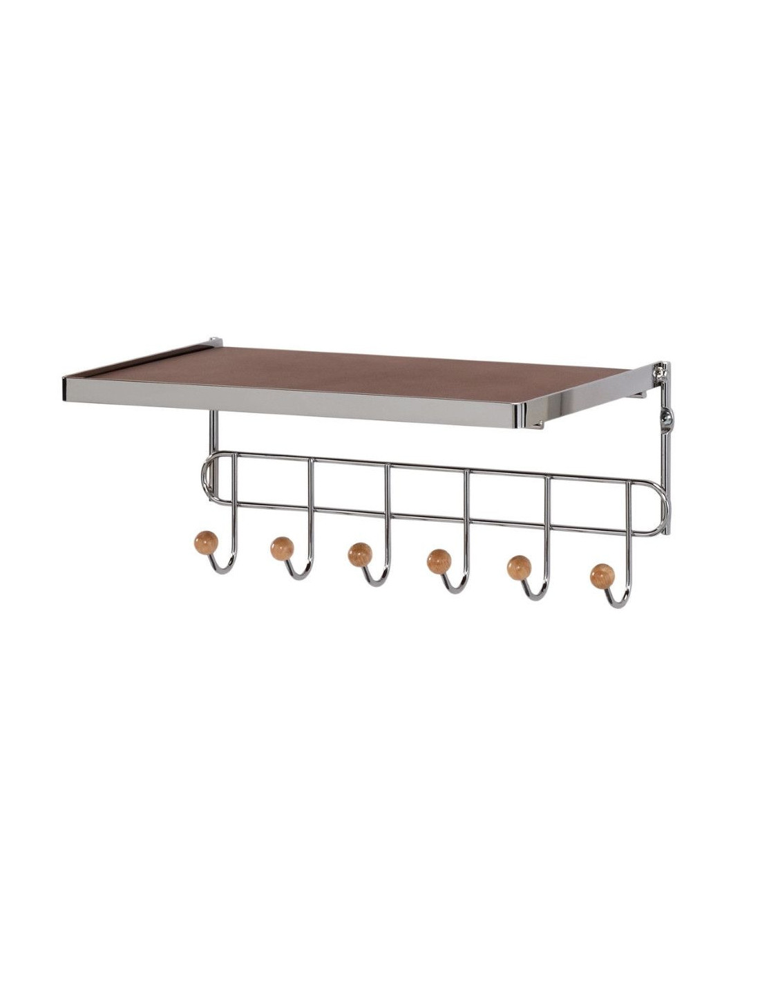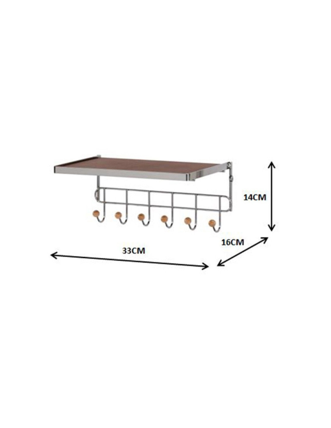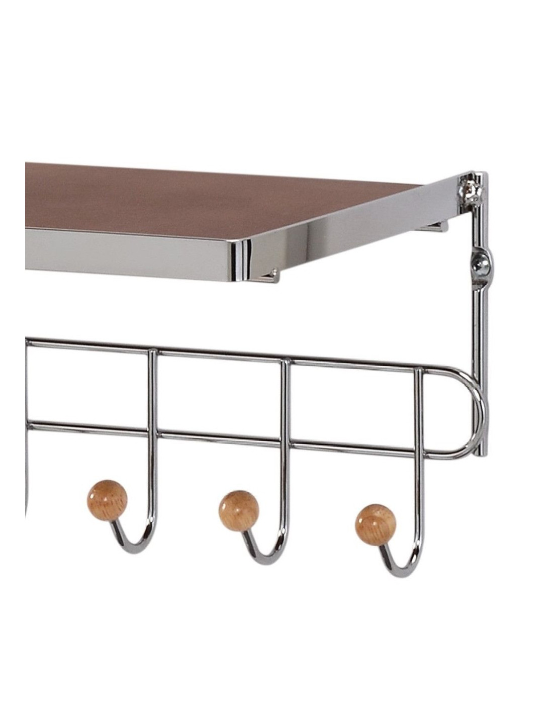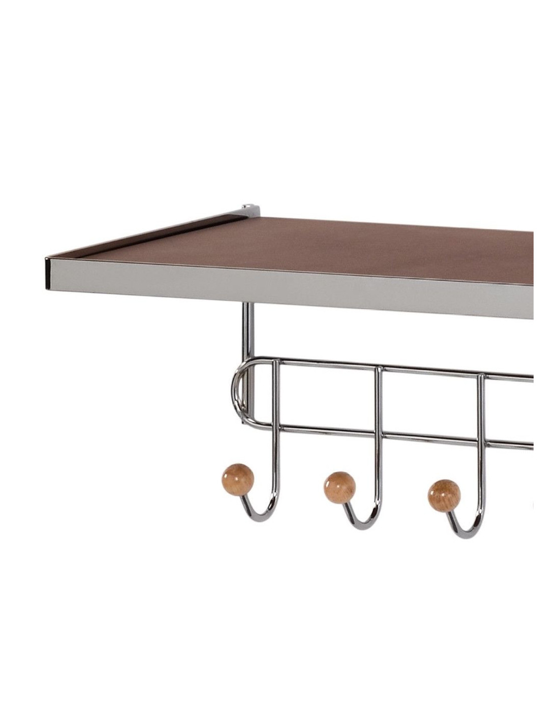 Moderna višenamjenska zidna vješalica u kombinaciji kroma i boje oraha. Okvir je izrađen od čelika i ima kromiranu završnu obradu. Vješalica ima policu na vrhu na koju možete odložiti ključeve, novčanik itd. Polica i kuke za vješanje izrađene su od MDF materijala.